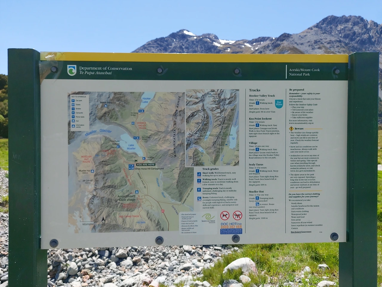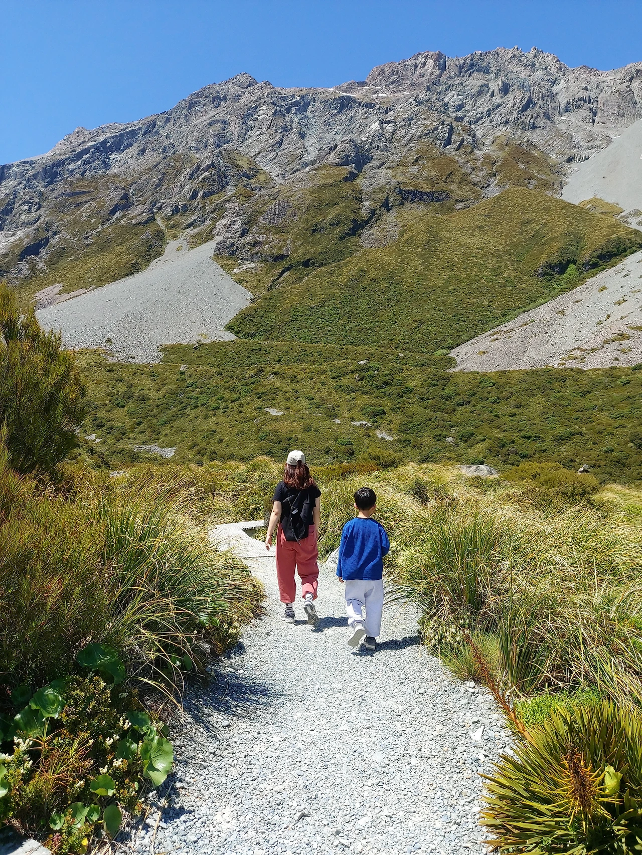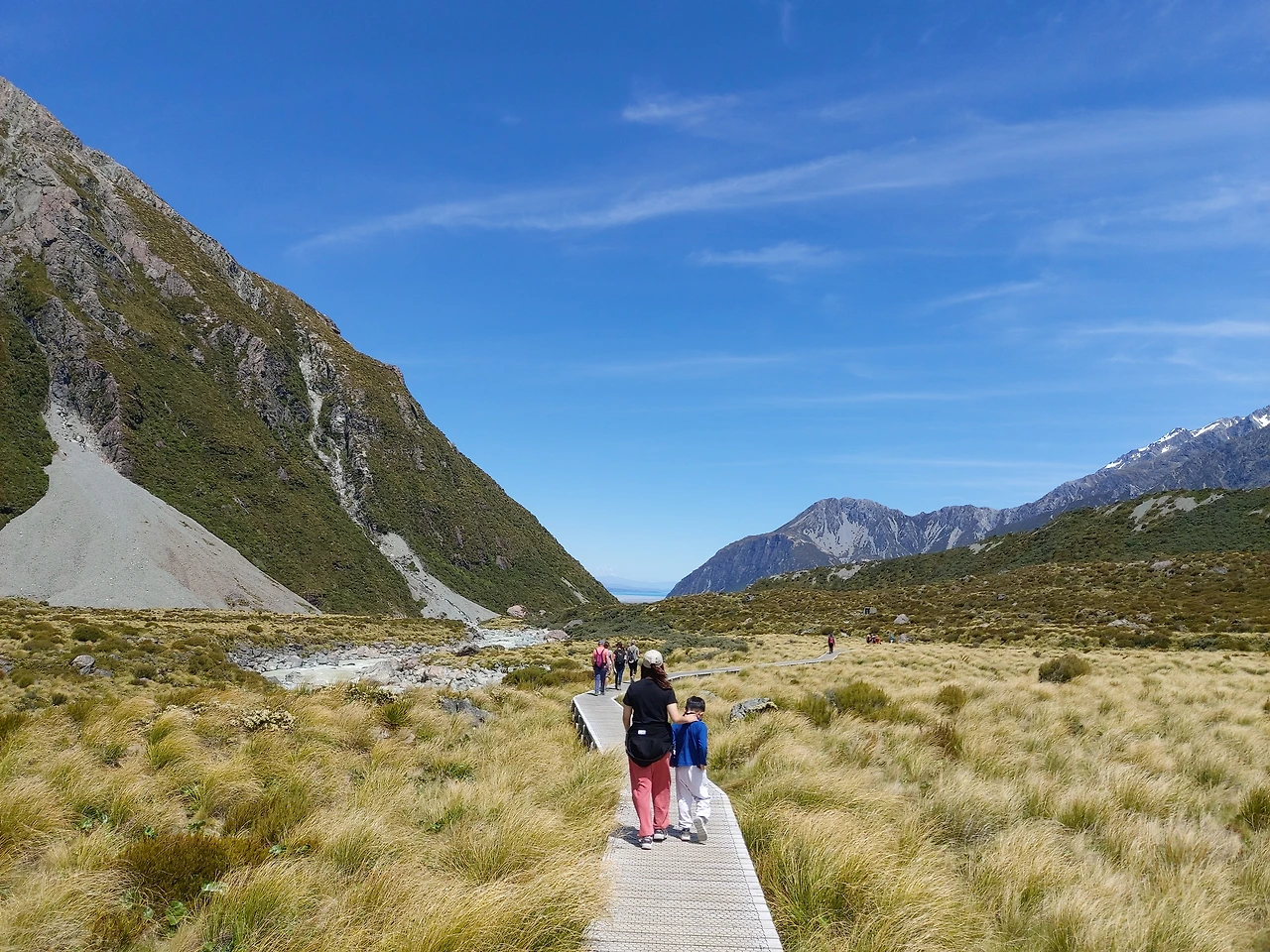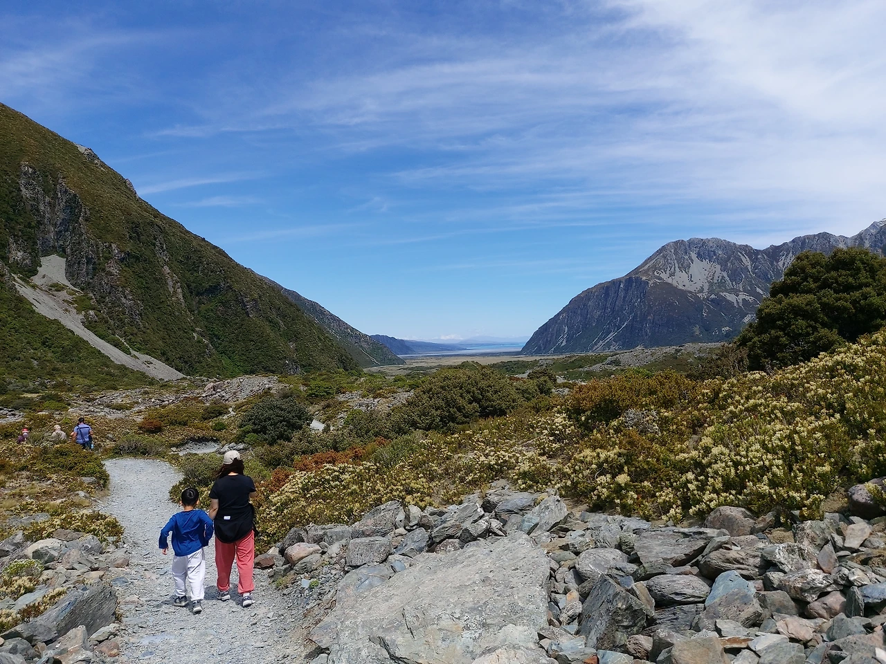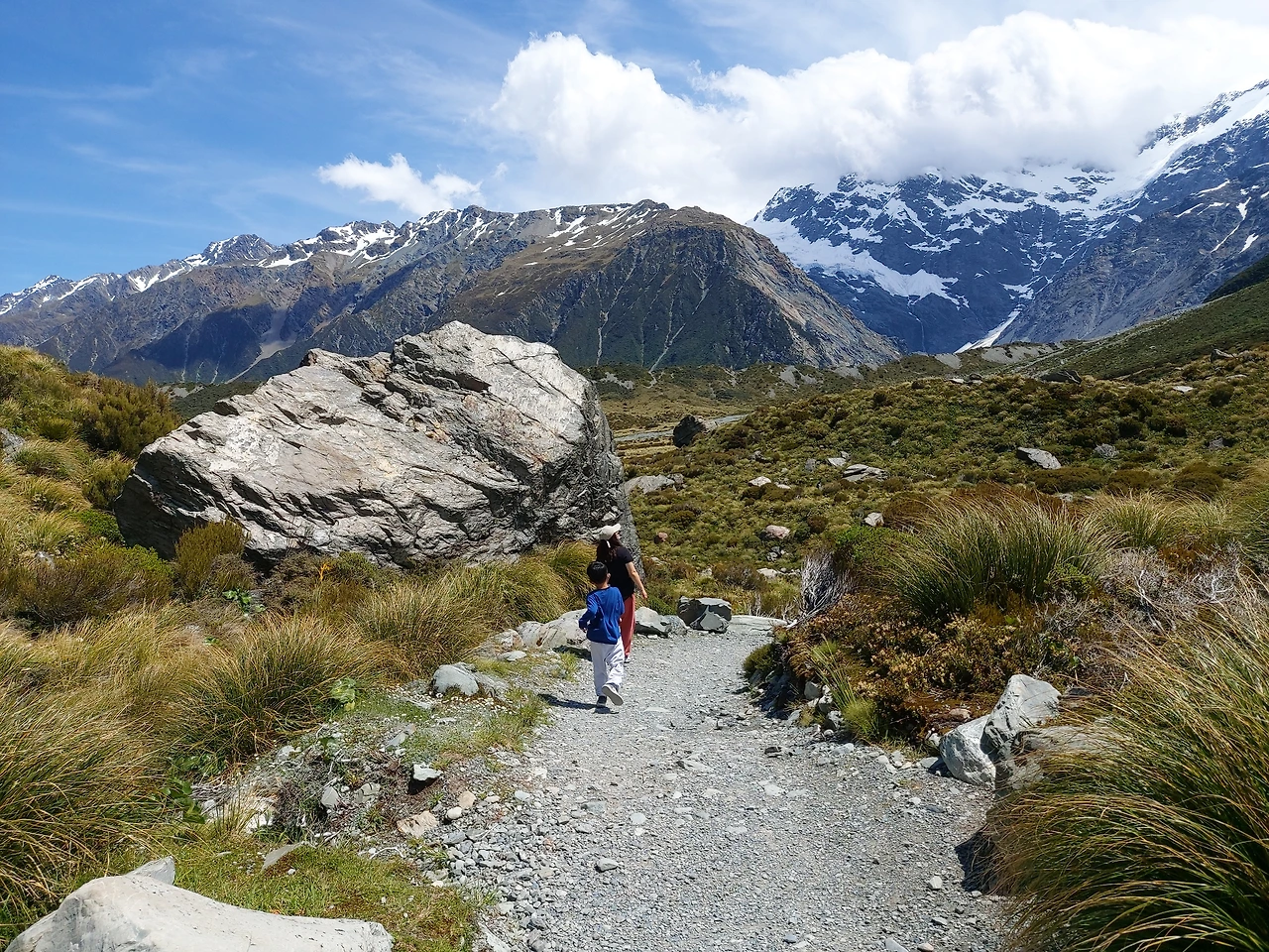 푸카키 호수가로 이어진 멋진 풍광의 길을 따라서 1시간을 더 달렸다. 이윽고 거대한 만년설이 보이는 마운트 쿡 국립공원에 도착할 수 있었다. 그리고 후커 밸리 트래킹을 위해서 주차장에 차를 세우고 탐방 준비를 했다. 후커 밸리 코스는 약 10km의 거리로 약 3시간 정도 걸리는 산행길이었기에 우선은 넉넉히 먹고 떠나는 것이 중요했다. 캠퍼밴에서 물을 끓여서 컵라면을 먹고 우리 가족은 본격적인 산행을 시작했다.