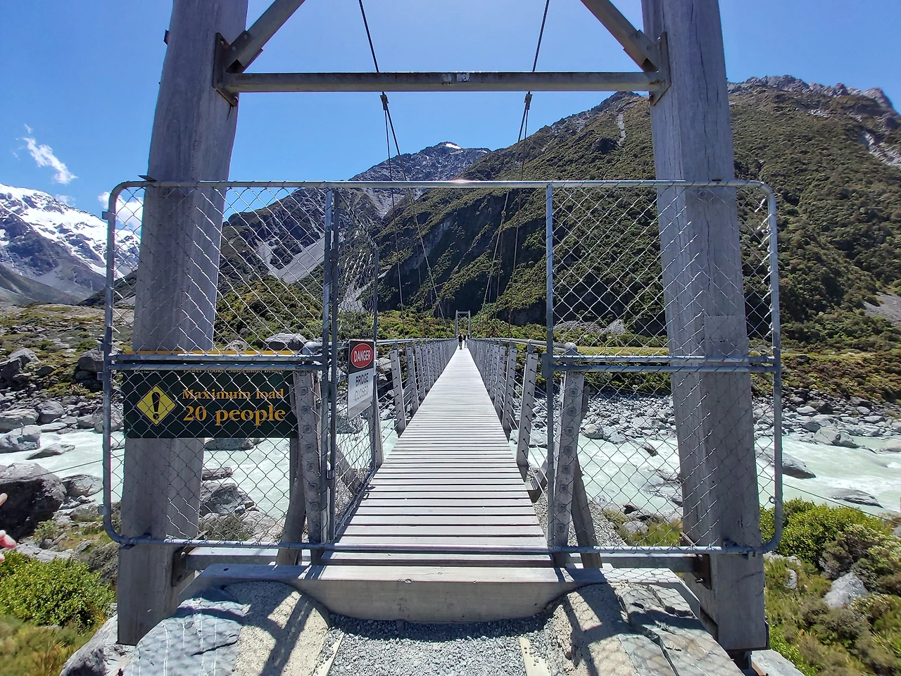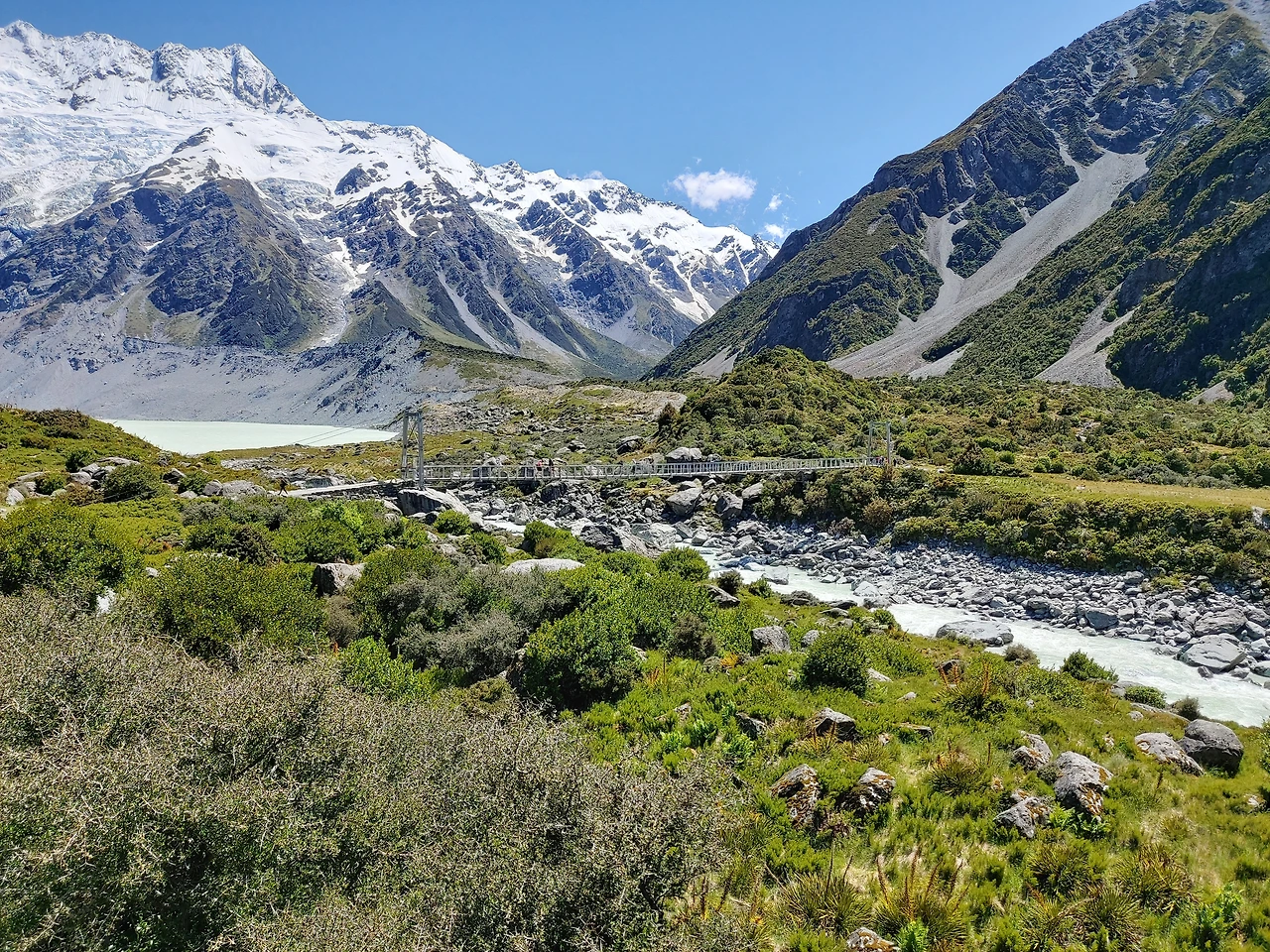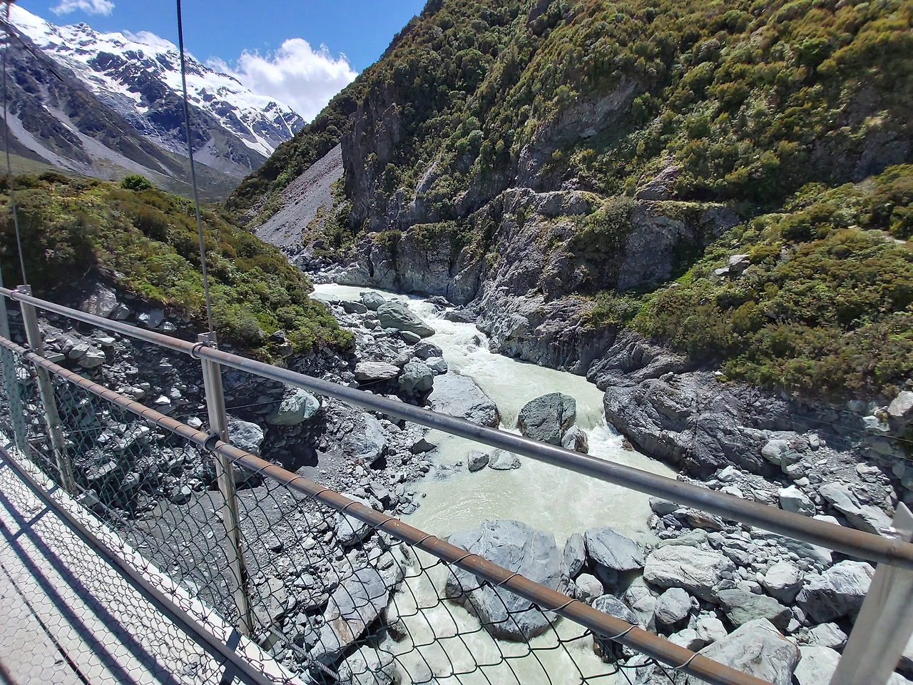 잠시 후 거센 물소리가 들려왔다. 2번 다리 밑을 지나는 계곡에서 나는 물소리였다. 마치 폭포처럼 어마어마한 수량이 계곡 아래를 흘러가고 있었다. 2번 다리는 1번 다리보다 더욱 긴 흔들다리로, 아래를 보는 순간 현기증이 날 정도로 스릴이 넘치는 다리였다. 역시 한 번에 20명 정도만 걸어갈 수 있다고 적혀있었다. 오는 길에 여기서 강풍을 만났는데 롤러코스터만큼의 스릴이 느껴질 정도로 아찔한 산악 다리였다. 2번 다리를 지나게 되면서 서서히 정면으로 마운트 쿡의 모습이 눈에 들어오기 시작했다. 이 산은 뉴질랜드에서 가장 높은 산으로 높이는 3,724m다. 산 위에 하얀색 만년설이 가득한 모습이 굉장히 인상적이었다. 보는 것만으로 자연의 위대함과 아름다움을 오롯이 느낄 수 있었다. 마운트 쿡과 주변 풍광을 즐기면서 긴 협곡을 약 40분 이상 걸었다.