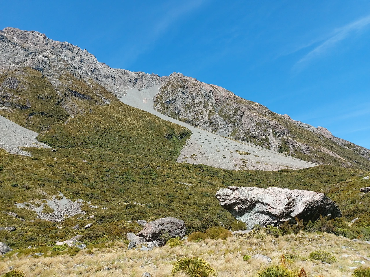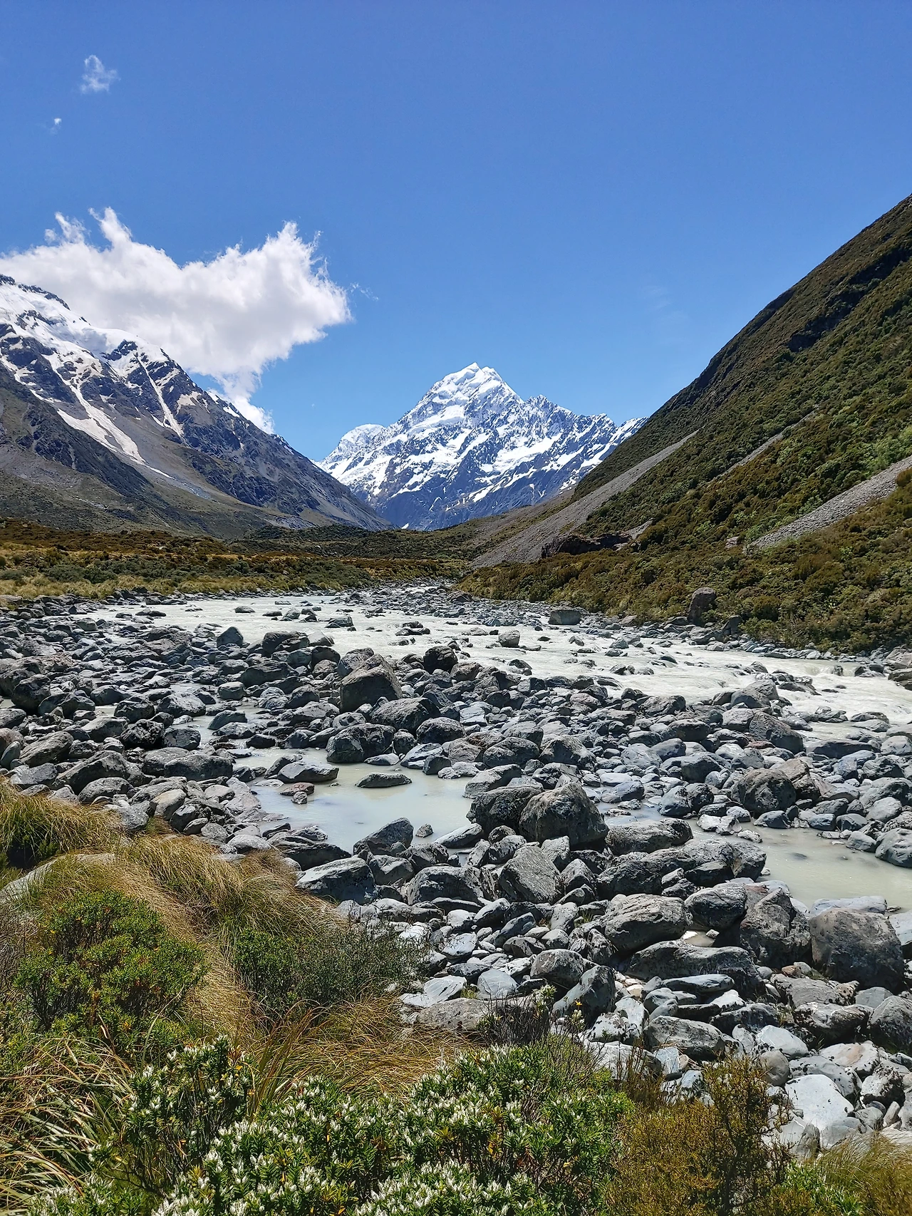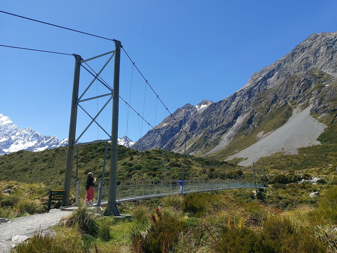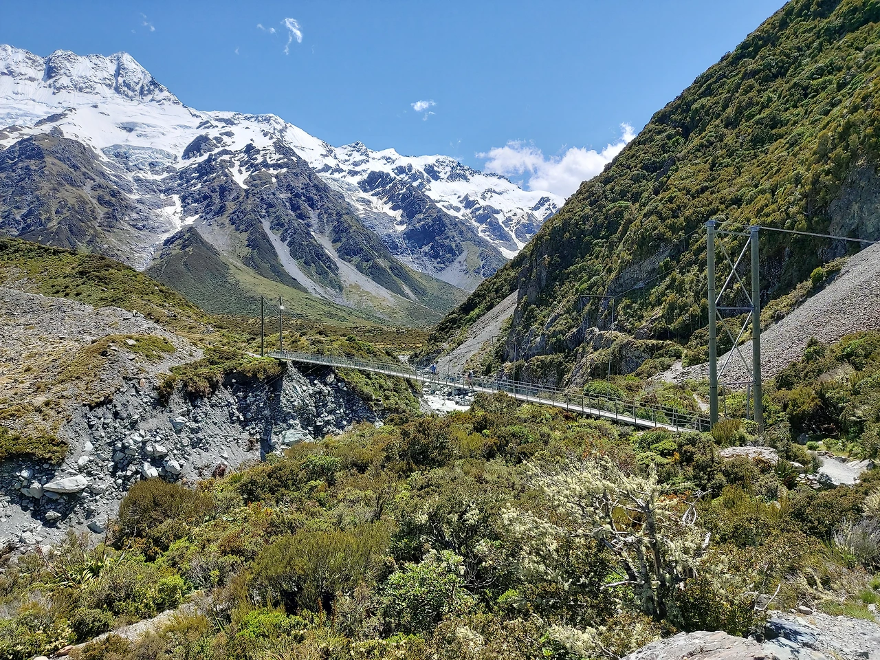 잠시 후 거센 물소리가 들려왔다. 2번 다리 밑을 지나는 계곡에서 나는 물소리였다. 마치 폭포처럼 어마어마한 수량이 계곡 아래를 흘러가고 있었다. 2번 다리는 1번 다리보다 더욱 긴 흔들다리로, 아래를 보는 순간 현기증이 날 정도로 스릴이 넘치는 다리였다. 역시 한 번에 20명 정도만 걸어갈 수 있다고 적혀있었다. 오는 길에 여기서 강풍을 만났는데 롤러코스터만큼의 스릴이 느껴질 정도로 아찔한 산악 다리였다. 2번 다리를 지나게 되면서 서서히 정면으로 마운트 쿡의 모습이 눈에 들어오기 시작했다. 이 산은 뉴질랜드에서 가장 높은 산으로 높이는 3,724m다. 산 위에 하얀색 만년설이 가득한 모습이 굉장히 인상적이었다. 보는 것만으로 자연의 위대함과 아름다움을 오롯이 느낄 수 있었다. 마운트 쿡과 주변 풍광을 즐기면서 긴 협곡을 약 40분 이상 걸었다.