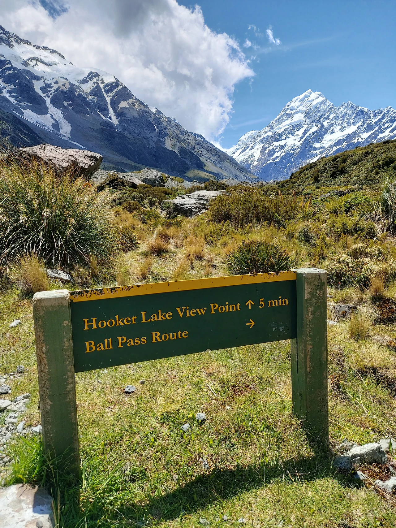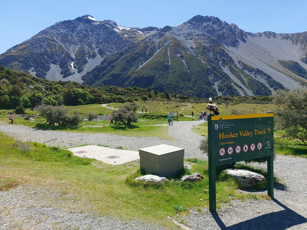 후커밸리 입구에서 4년 전 그날이 생각났다. 그때도 이곳에 왔지만, 폭설로 인해서 입구가 통제되어서 후커 밸리 트래킹은 할 수가 없었다. 단순히 키포인트에 들러서 뮬러 호수를 둘러보고 아쉽게 일정을 마칠 수밖에 없었다. 그 아쉬움을 드디어 오늘 풀 수 있었다.다시 찾은 보람이 있어서 너무나 뿌듯했다. 탐방로 입구에는 오전부터 몰린 각국의 관광객들로 가득했다. 등산복부터 트레이닝복, 평상복을 입은 사람들이 주차장을 가득 채웠다. 이곳이 뉴질랜드 최고의 관광지임을 실감살 수 있었다. 트래킹을 시작하려니 왼쪽의 웅장한 세프턴 산(Mt. Sefton)이 가장 먼저 눈에 들어왔다.