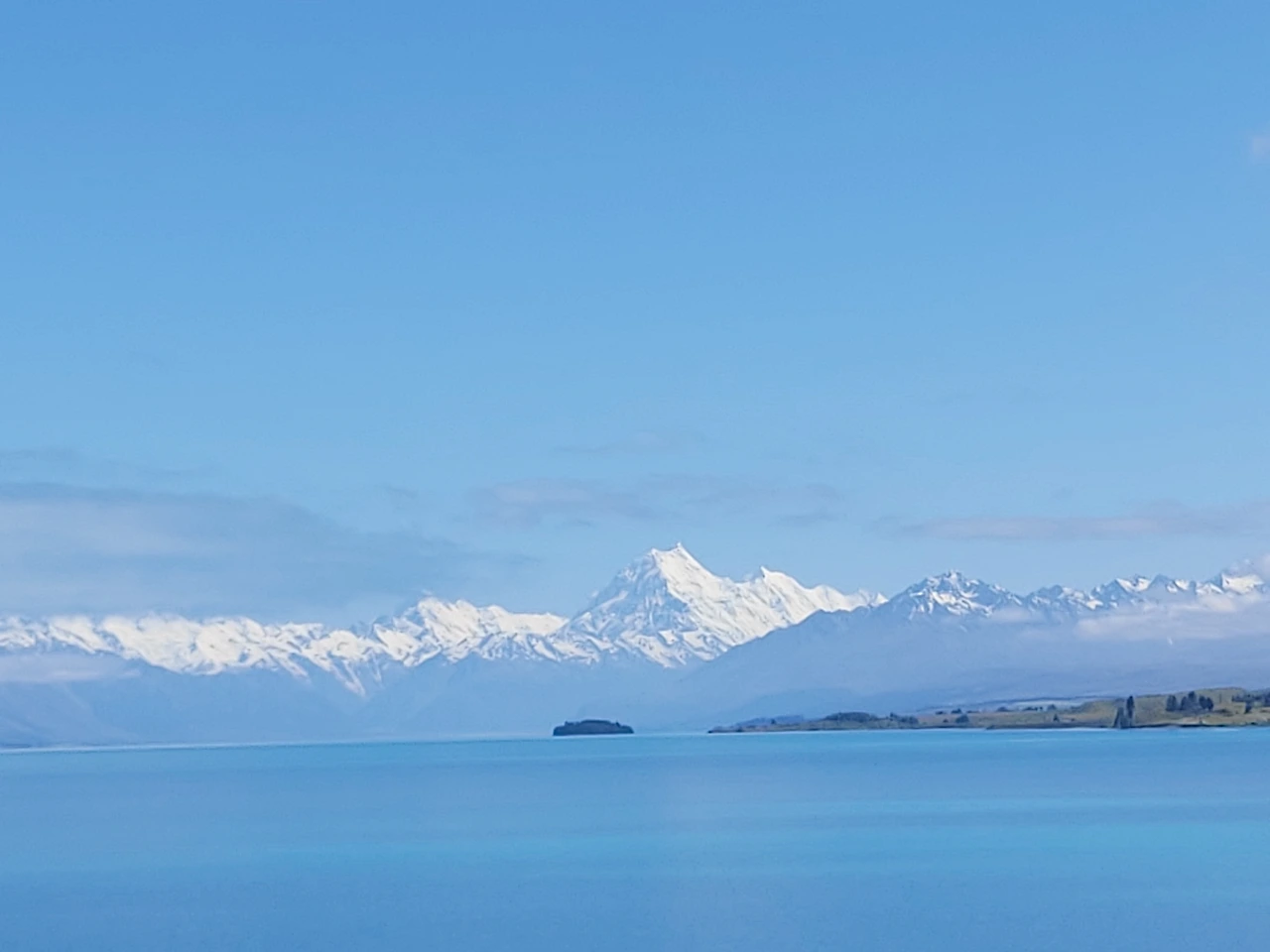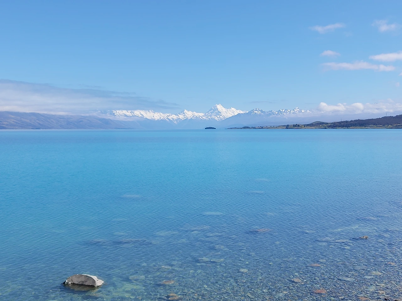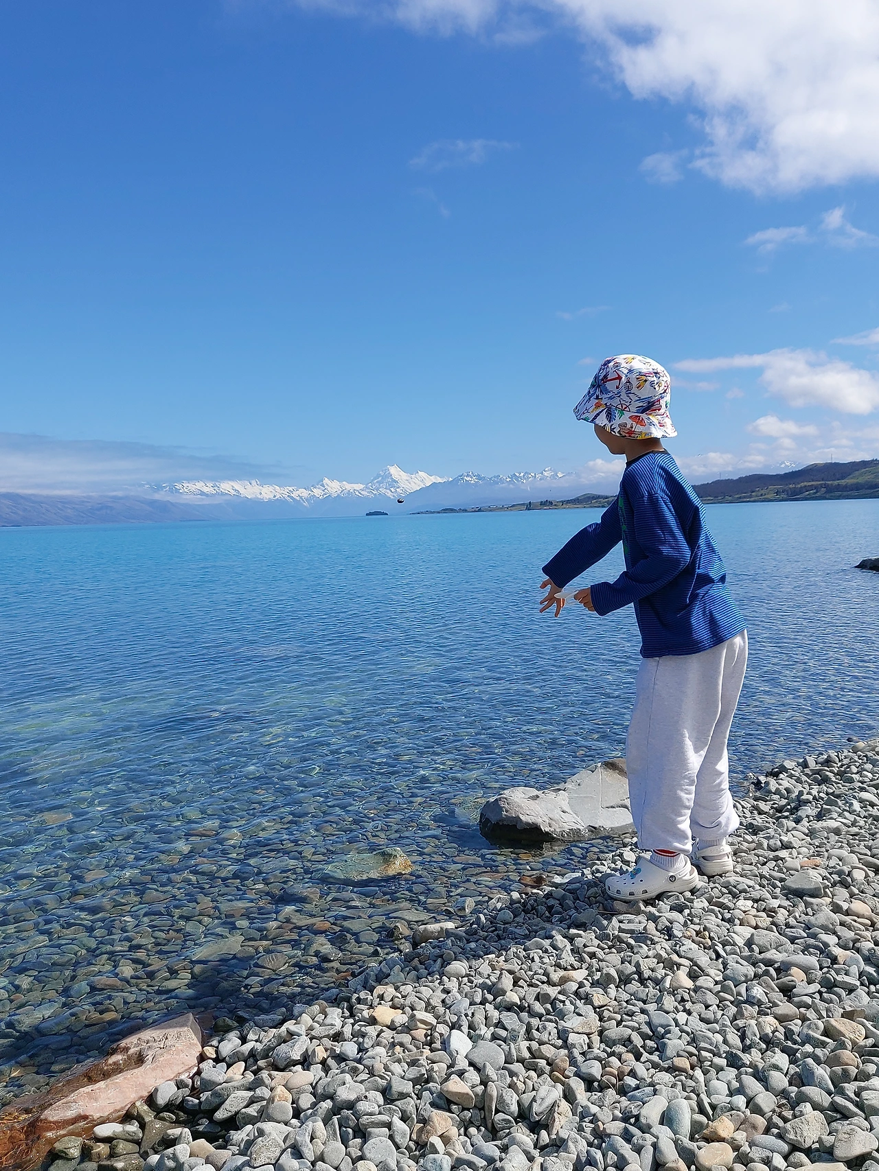 호수 전망대에 잠시 차를 세우고 바다처럼 넓게 펼쳐진 푸카키 호수를 바라봤다. 푸카키 호수는 하늘 아래 첫 번째 물이라는 뜻으로, 아오라키 마운트 쿡에서흘러내린 빙하수가 고여서 만들어진 빙하호수였다. 그리고 푸카키 호수 너머로 만년설이 가득한 마운트 쿡의 모습도 저 멀리 들어왔다. 50km 이상 떨어진 산이었지만, 맑은 날씨로 인해 그 모습을 선명하게 볼 수 있었다. 호수의 물을 만져보고 싶다는 아이의 말에 호수가로 내려왔다. 생각대로 차가운 호수 물. 잠시 아이와 함께 물제비 놀이를 즐겼다. 그리고 다시 차에 올라서 마운트 쿡으로 열심히 달렸다.
