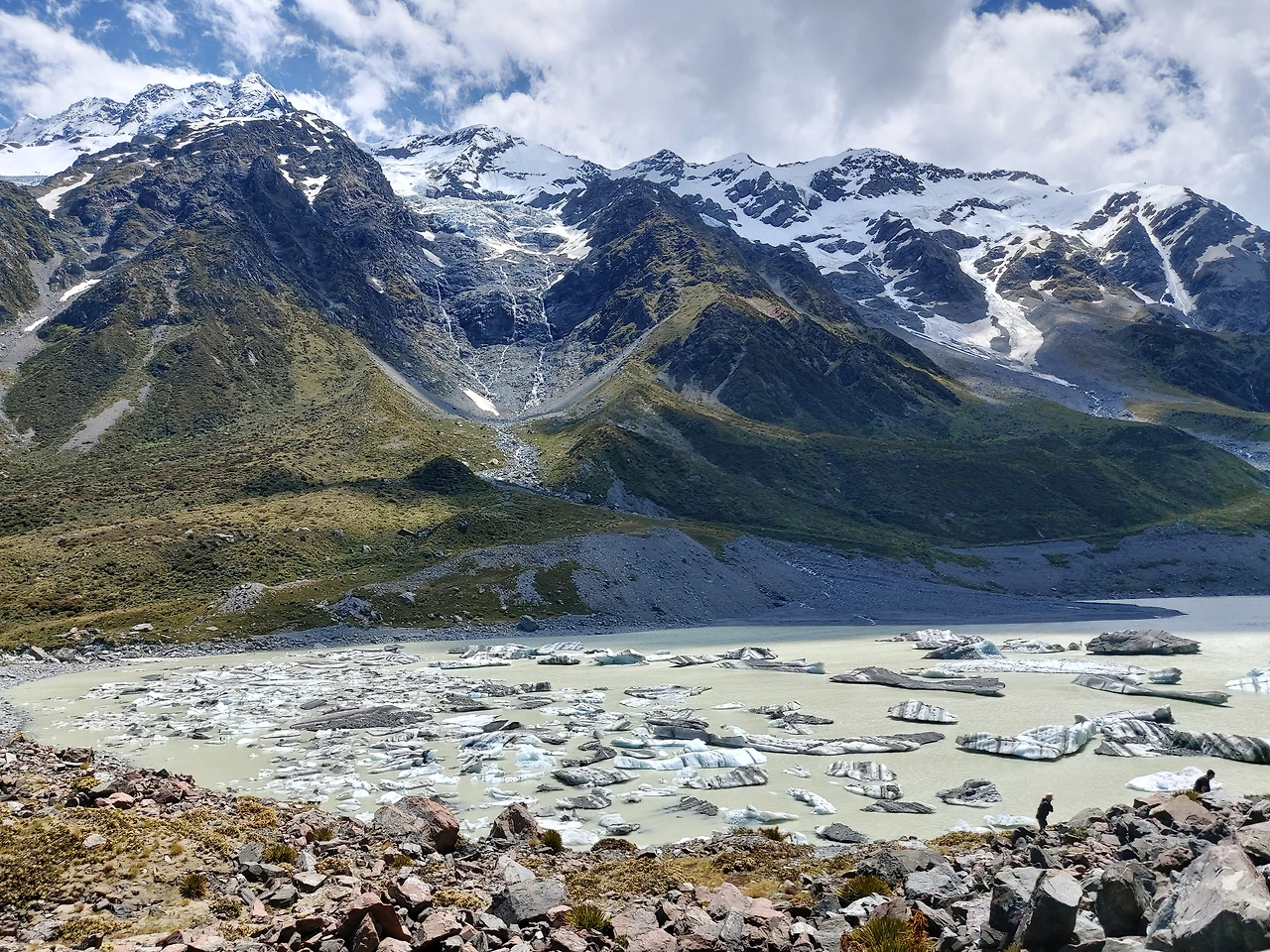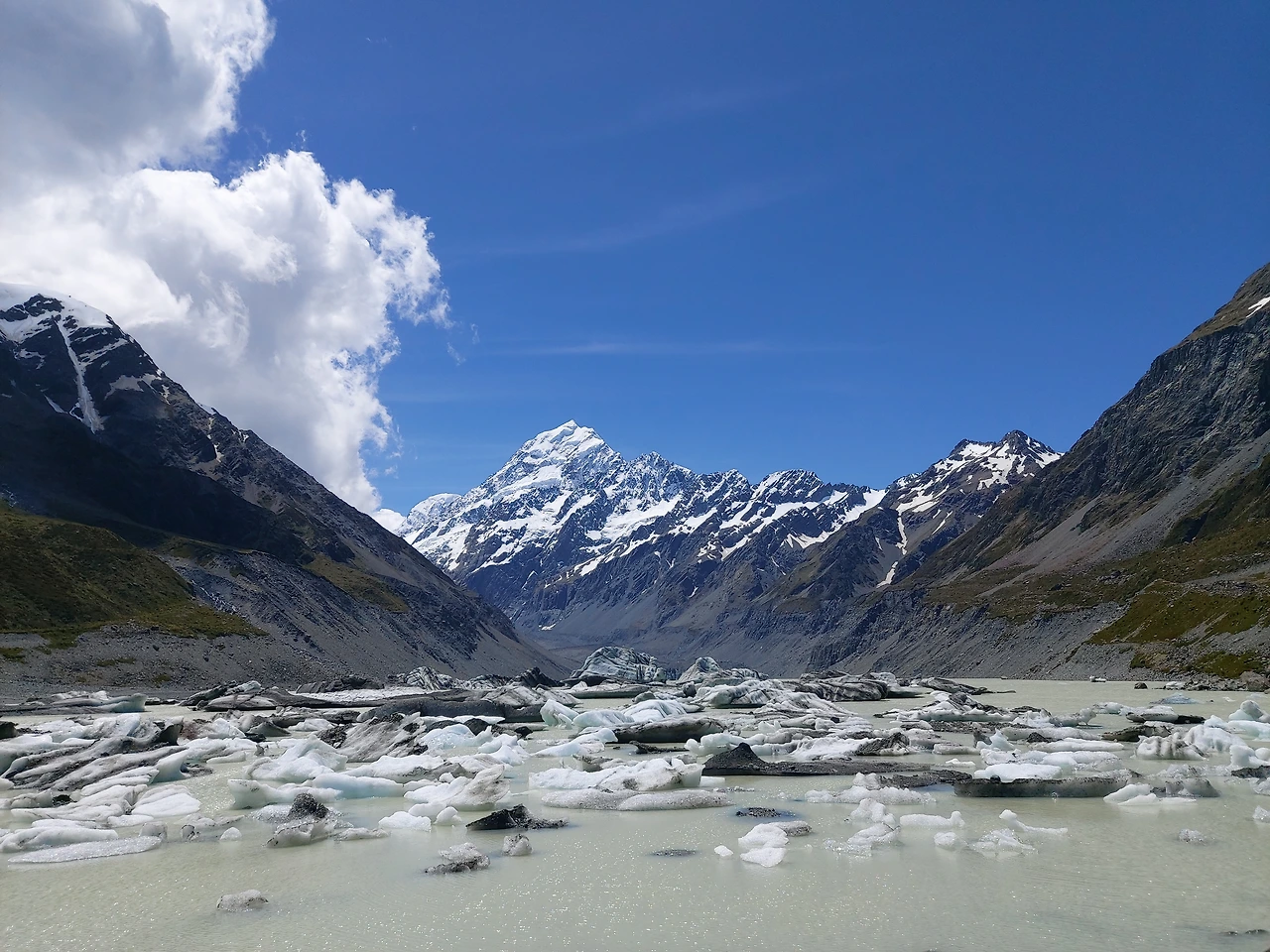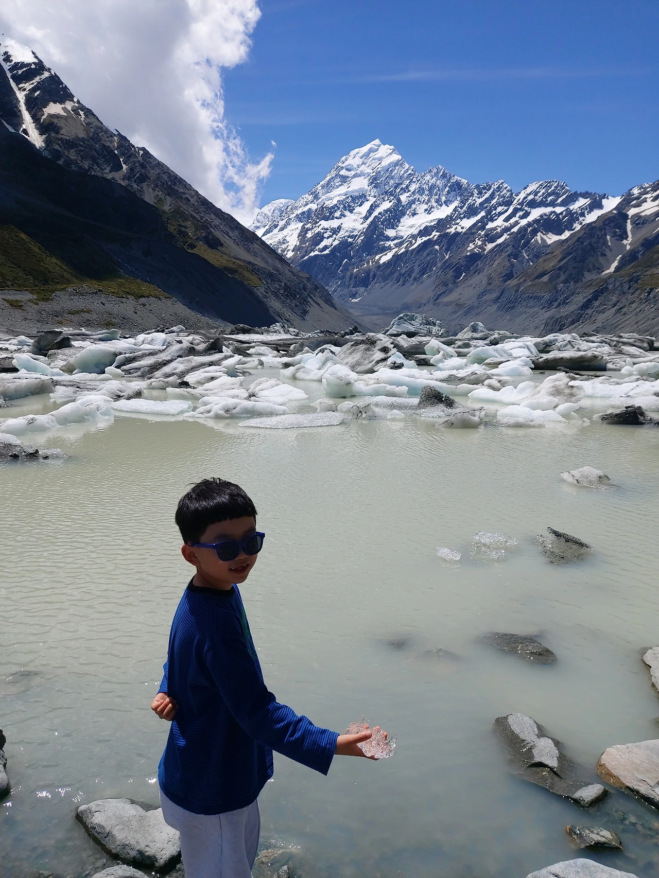 바로 '빙하'였다. 수십 개의 빙하 조각이 호수 위에 떠 있는 것이었다. 그 유빙의 크기 또한 실로 어마어마했다. 사진 몇 장을 찍고 호수가로 내려갔다. 빙하가 호수에 떠 있는 유빙을 손으로 직접 만져볼 수 있었다. 수십만 년 된 빙하를 만져보다니 우리 모두는 놀라지 않을 수 없었다. 후커 밸리에서 만난 만년설과 빙하는 인생 최고의 경험이었다. 수만년 전의 얼음 속 역사와 현재가 만나는 순간이었다. 뉴질랜드는 겨울이 지나고 여름이 시작되고 있었기에 수많은 유빙들이 빙하에서 떨어져 나오고 있었다.