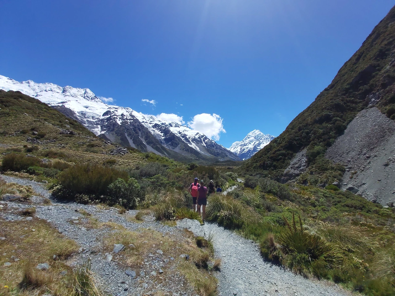 세프턴 산은 마운트 쿡 빌리지에서 왼쪽에 보이는 설산으로, 마운트 쿡으로 착각할 만큼 그 웅장함이 대단했다. 후커 밸리 트랙은 세프턴 산의 앞쪽에 생성된 뮬러 빙하 호수를 지나서 빙하가 만든 계곡을 따라서 후커 호수까지 걸어가는 코스였다. 빙하로 생성된 거대한 U자 계곡을 걸으면서 만년설이 있는 마운트 쿡을 비롯하여 2개의 빙하호수와 빙하 계곡, 그리고 3개의 다리를 경험할 수 있기에 많은 사람들에게 인기를 모으고 있는 후버 트래킹 코스였다. 시작부터 바람이 많이 불었지만, 기온은 20도 정도로 따뜻해서 산행에는 큰 무리가 없었다. 다만 햇살이 너무나 뜨거워 자외선 노출에 조심해야 했다. 길은 경사도 없이 평탄한 길의 연속이었다.