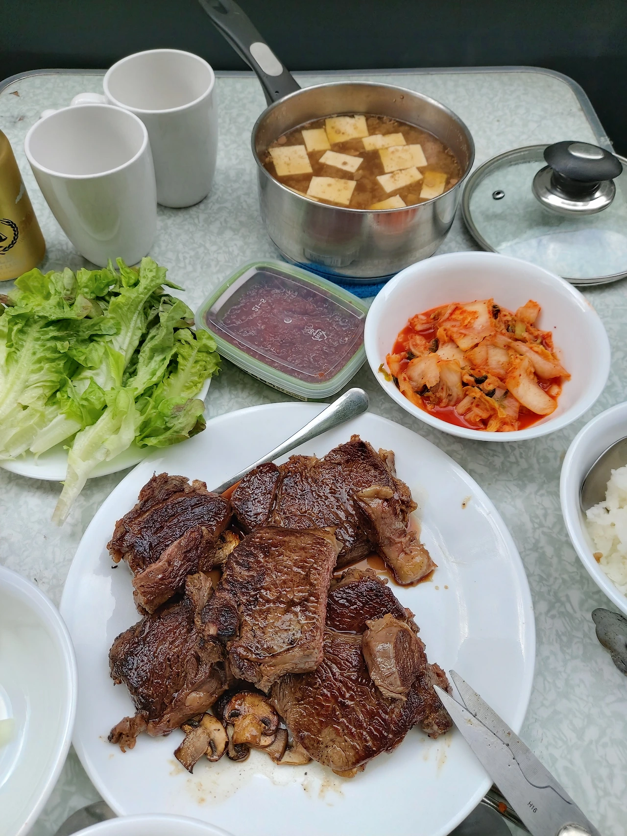 그리고 저녁 6시쯤에 저녁식사를 준비했다. 오는 길에 아시안 상점에서 구매한 잘 익은 김치와 함께 뉴질랜드산 소고기와 상추, 그리고 된장찌개까지 완벽한 한식 요리를 준비했다. 아내는 된장찌개와 밥을 하고, 나는 바비큐 존으로 이동해서 고기를 구웠다. 몇 번의 실패 끝에 이번에는 육즙 가득한 고기를 구을 수 있었고, 아내 또한 한국에서의 그 맛 그대로의 된장찌개를 준비했다. 다만 그 냄새가 걱정돼서 된장찌개는 공용 식당이 아닌 차 안에서 끓일 수밖에 없었다는 사실이 조금 안타까웠다. 우리 가족은 캠핑카 옆에 마련된 식탁에 둘러 앉아서 오랜만에 최고의 한식을 맛볼 수 있었다.