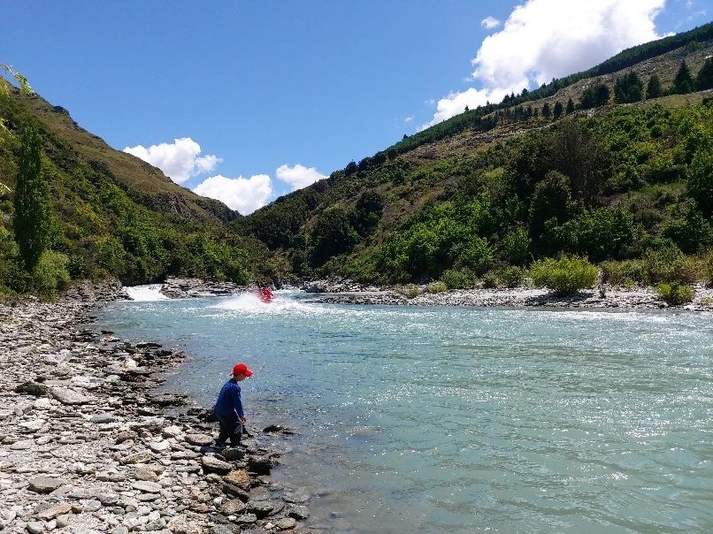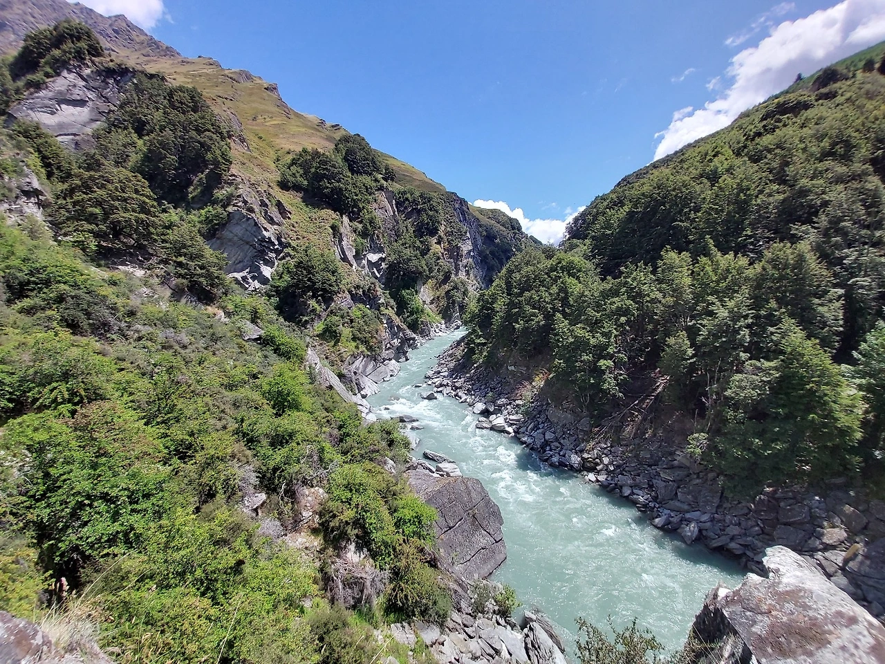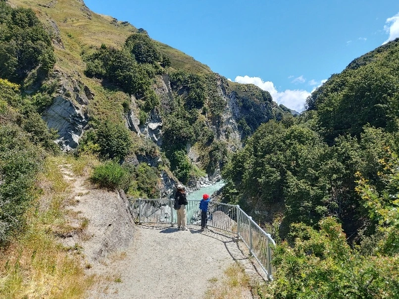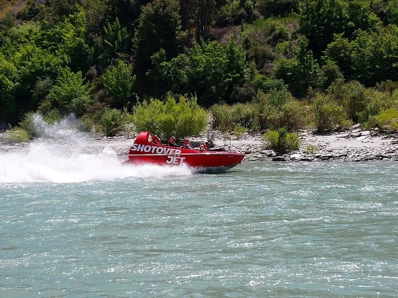 그리 유명하지 않는 트래킹 코스라서 지나는 사람들은 대여섯 명이 전부였다. 약 30분 정도 평탄한 길을 따라서 길으니 트래킹의 종점인 터널 워크 전망대(historic tunnel walk lookout)가 나타났다. 경치하나는 최고였다. 햇살이 너무나 뜨거워서 사진 몇 장을 찍고 다시 차로 향했다. 돌아오는 길은 트래킹 로드가 아닌 강가를 따라서 걸었다. 길을 따라서 걷는데, 갑자기 굉음을 내면서 빨간 제트 보트가 나타났다. 쇼토버 강의 관광 제트보트였다. 좁은 강을 따라서 달리는 보트가 우리 앞을 지나갔고, 우리는 보트에 타고 있는 사람들에게 손을 흔들어줬다. 신기한 체험이었다. 빠르게 지나가는 보트를 뒤로 하고 다시 퀸스타운으로 향했다.