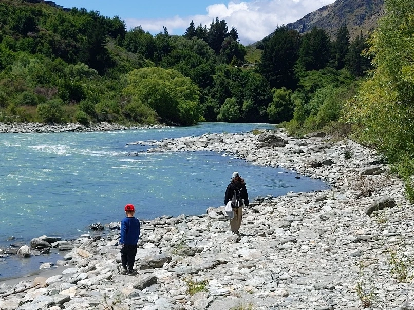 퀸스타운 도심을 한 바퀴 둘러보고 우리는 도시 북쪽에 있는 쇼토버 강(Shotover river)으로 차를 타고 향했다. 이곳에는 강가를 따라서 아주 오래된 옛길이 트래킹 로드로 만들어져 있었고, 거리도 2km 정도로 1시간이면 왕복이 가능했다. 차를 공터에 세우고 트래킹 로드를 걸었다. 가는 길은 고운 모래로 가득했다. 길은 빙하가 녹아서 흘러내리는 쇼토버 강의 거센 물결이 보이는 강가로 이어졌다.