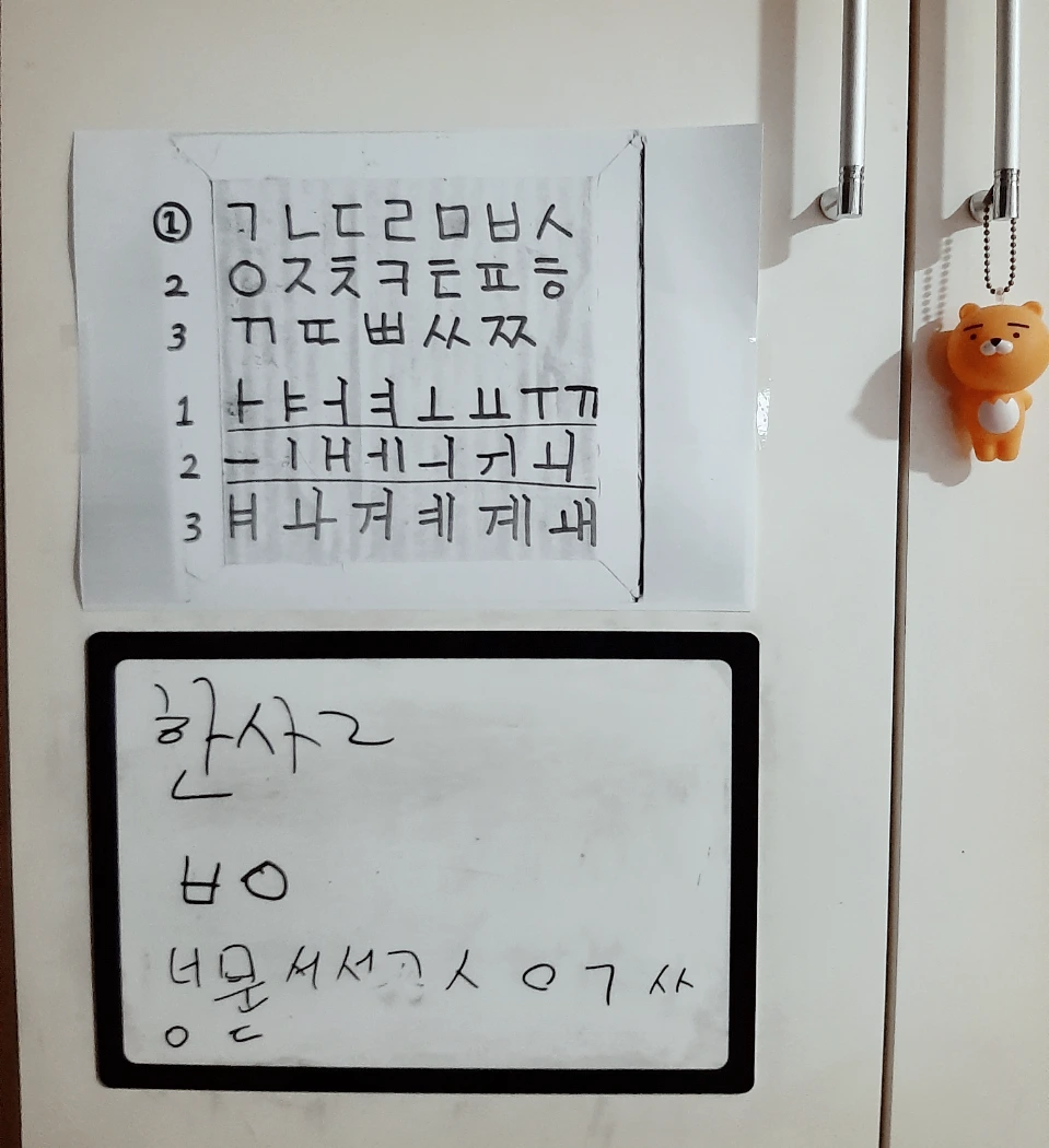 그런데, 이 글자판을 직접 사용해 보려고 하니 처음에는 약간 어렵게 느껴졌어요. 익숙해지면 더 편할 수도 있겠지만 당장 소통이 되지 않다 보니 급한 마음에 제가 직접 간단하게 글자판을 만들었답니다.