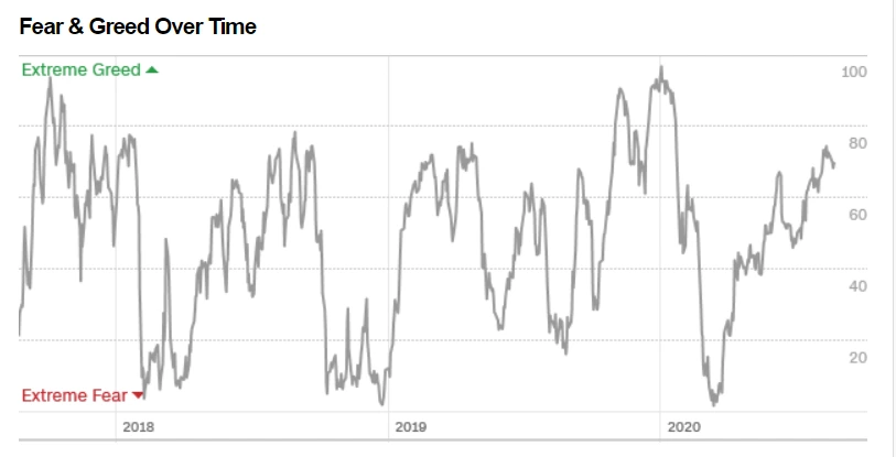 2020년 8월21일 현재 지수는 70으로 비교적 낙관적인 수치를 나타내고 있어요. ‘공포에 사고 탐욕에 팔아라’라는 전략에 따르면 보통 20미만이면 매수를, 80이상이면 매도를 한다고 합니다. 2018년부터 지금까지의 상황을 보면 총 세차례 익스트림 피어에 근접했던 것을 볼 수 있습니다. 이는 VIX 지수와는 유사합니다. VIX 지수는 2018년 2월에, 2018년 12월에, 2020년 3월에 상승했어요.