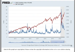 VIX 지수가 높았을 때 S&P500 지수가 하락했다는 걸 볼 수 있습니다. VIX 지수와 S&P500 지수는 반대로 움직이죠.