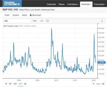 보통 VIX 지수가 30 이상이면 변동성이 높다고 하고 20 이하면 낮다고 합니다. 지난 25년간 S&P VIX 지수를 볼게요.