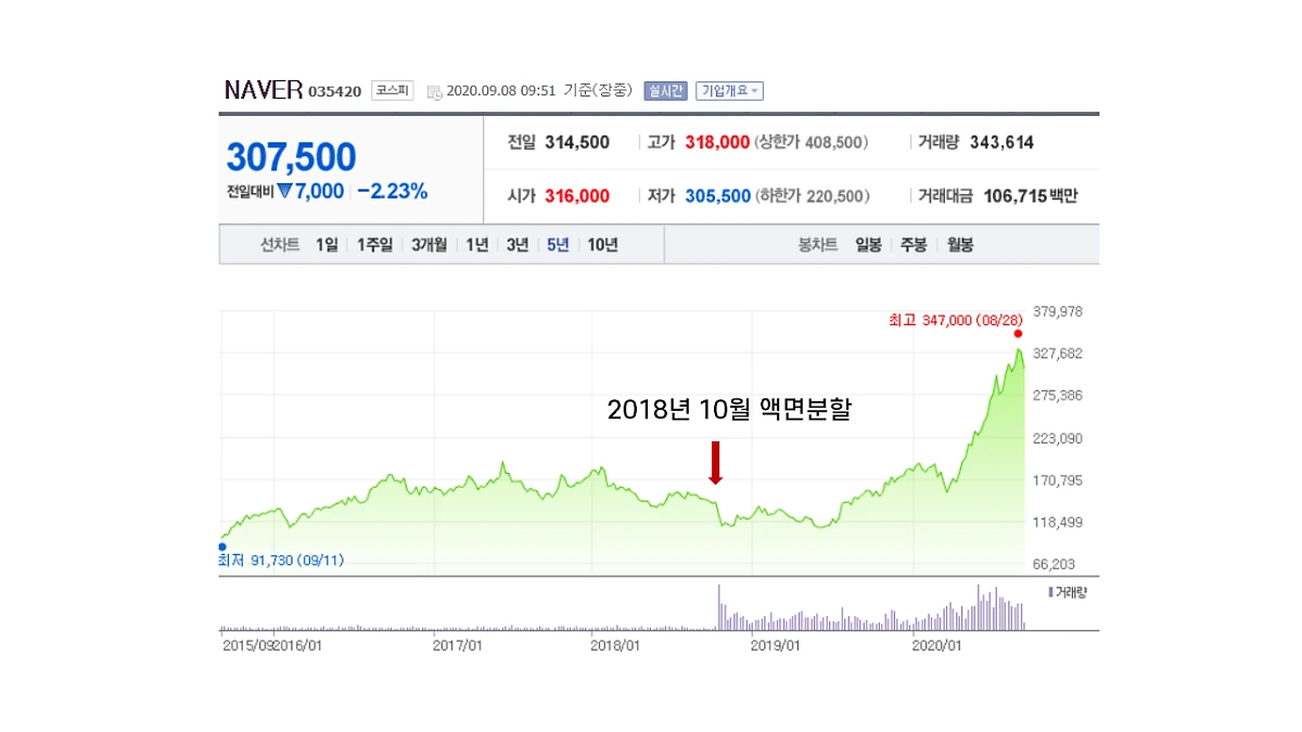 실제로 삼성전자는 2016년부터 2017년 말까지 꾸준하게 계속 상승을 했다가 2018년 5월에 액면분할 이후에는 한동안 크게 상승세를 타지 못했습니다. 네이버는 2018년 10월에 5대1 액면분할을 한 뒤 한동안 크게 상승을 하지 못했죠.