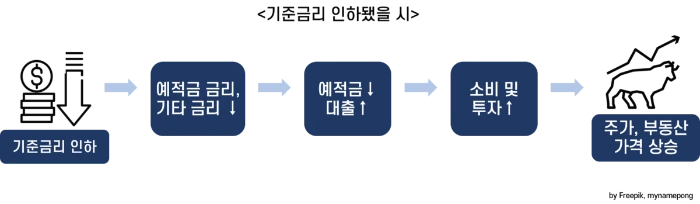 기준금리가 인하되면 돈의 가격이 저렴해진다는 의미죠. 기준금리가 인하되면 예금 및 대출금리도 낮아지게 됩니다. 예금금리가 낮으면 사람들은 저축보다는 소비를 하게 됩니다. 그리고 대출금리가 낮으면 저렴한 가격에 돈을 빌려서 기업들은 투자를 할 동기가 더 높아지게 됩니다.