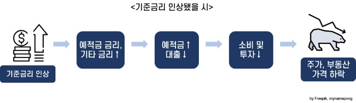 기업들은 돈의 가격이 낮아야 대출을 하거나 저렴한 비용으로 회사채를 발행해 투자자금을 모아 투자를 할 수 있게 되는데, 금리가 높으면 투자를 그만큼 줄이게 됩니다. 기준금리가 인상이 되면 주가는 하락하고 부동산 시장도 얼어붙는다는 이야기가 바로 이 때문에 나오는 것입니다.