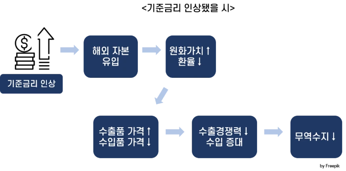 또 해외 투자자금도 높아진 한국 금리를 찾아 한국으로 들어옵니다. 해외 투자자금이 많이 유입이 되면서 원화 가치는 높아지게 되고 환율은 하락합니다. 환율이 하락하면 수출 경쟁력은 낮아지고 수입품 가격도 내려갑니다. 무역수지는 나빠지게 됩니다.
