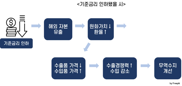 금리가 낮아지고 환율이 상승하게 되면 수출 경쟁력은 높아지고 수입 상품의 가격은 낮아집니다. 수출은 늘어나게 되고, 수입은 가격 상승으로 인해 수요가 줄어 수입은 감소하게 됩니다. 즉 기준금리 인하는 무역수지가 개선되는 효과도 있습니다.
