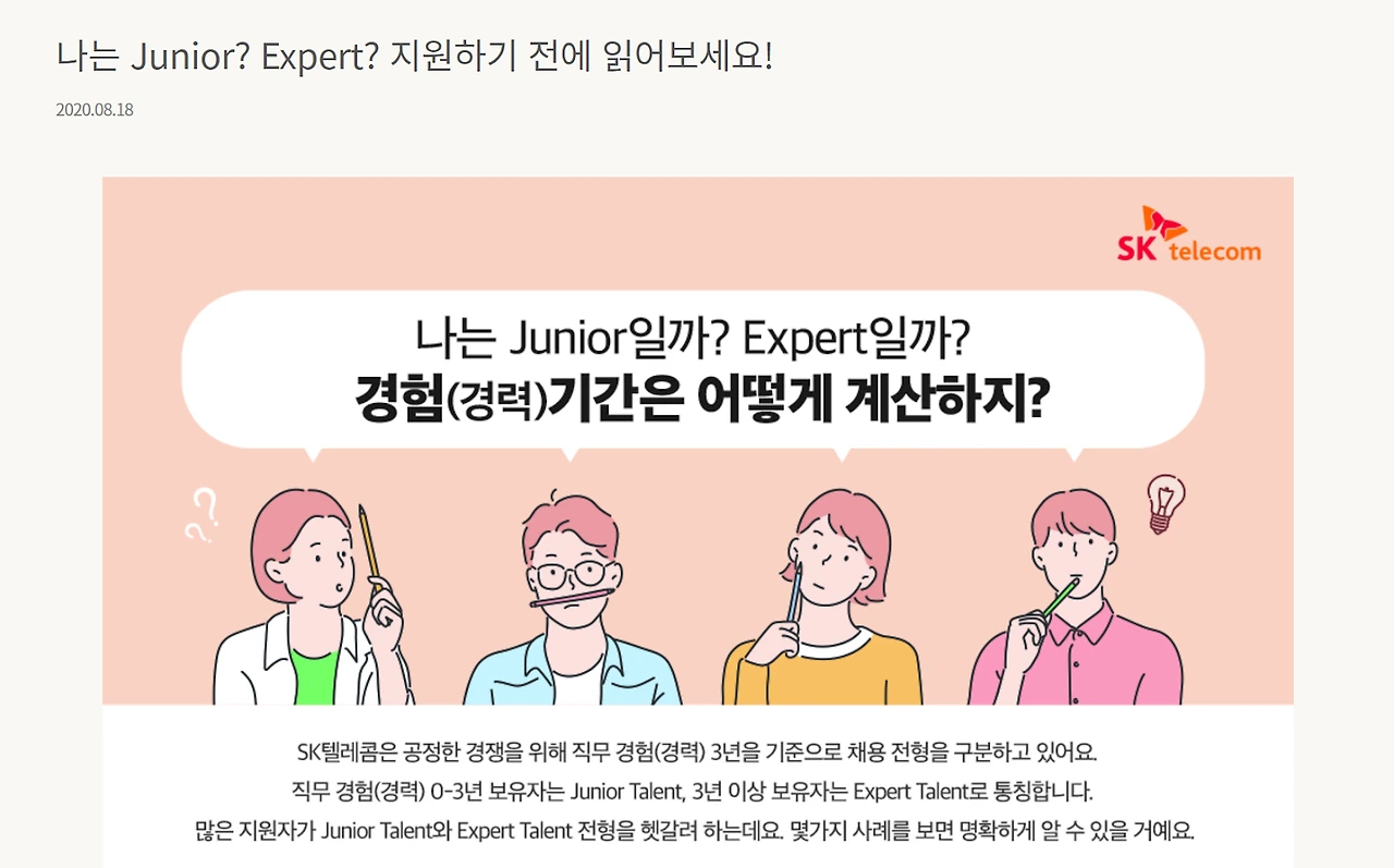 나는 이 글을 준비하면서, 아래 게시물을 찾아볼 수 있었다. 그리고 경악을 금치 못했다. 아래 게시물은 100대 대기업으로 불리는 SK텔레콤의 취업 포털에 나와 있는 글이다. 당연한 이야기이지만, SK텔레콤의 신입 공채 소식이 올라오는 웹 사이트였다. 물론 경력직도 결국 지원을 위해서 저런 사이트를 이용해야 하는 경우가 있지만, 보통 경력직의 경우는 헤드헌터나 지인 등을 통해 직접 이력서를 제출하지, 저런 사이트를 자주 방문하지 않는다. 즉, 저 글은 ‘신입’으로 지원하고자 하는 사람들을 대상으로 쓴 글이다.