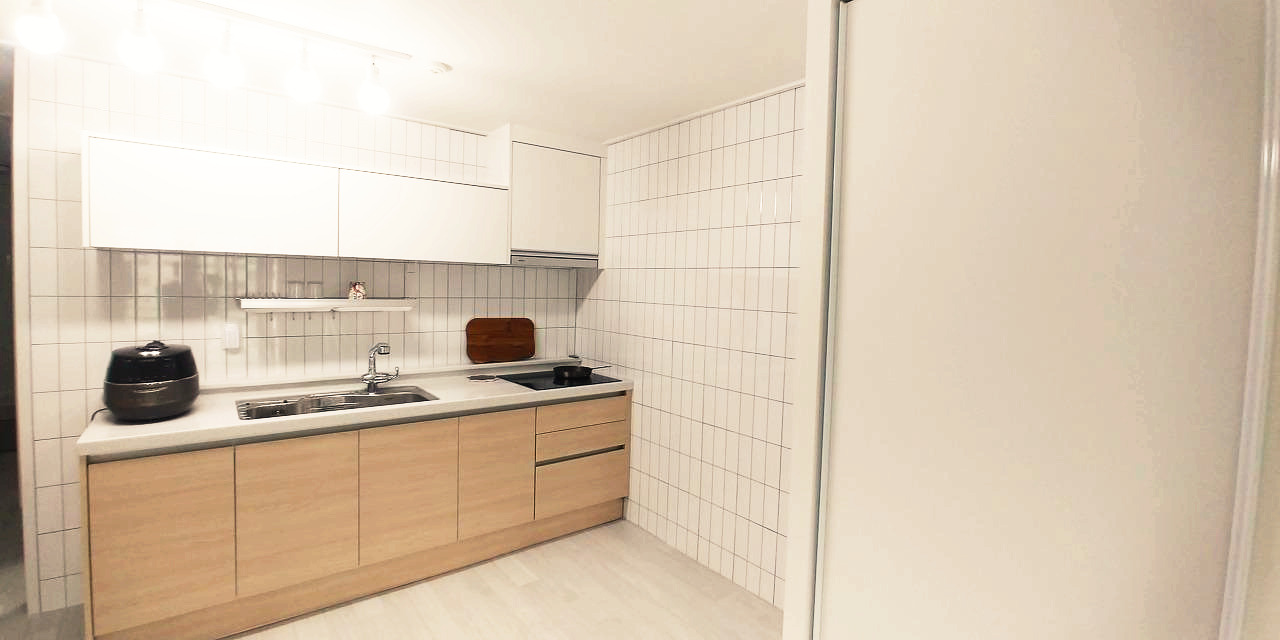 공간에 개방감을 주기 위해 부엌 수납을 반장으로 짜고, 하부장은 우드 포인트를 두었다.