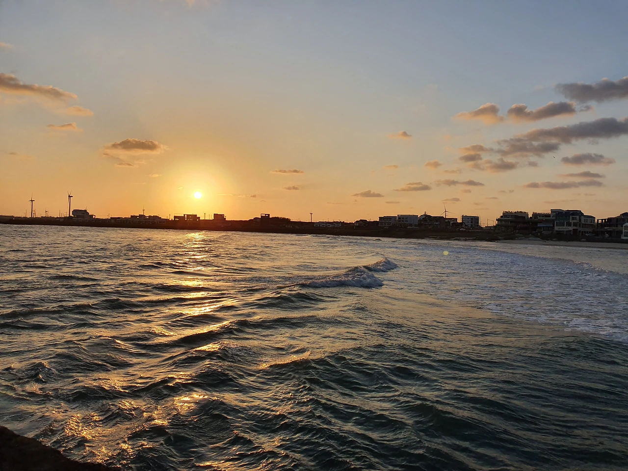 다음 날 새벽 여섯 시 반, 평소라면 늦잠으로 흘려보낼 시간이지만 제주의 첫 일출을 놓치지 않기 위해 밖으로 나갔다. 전날 어둠이 가리고 있던 월정리의 골목과 하늘이 선명하게 모습을 드러냈다. 저 멀리 발갛게 물든 해가 막 떠오르려던 참이었다. 요란하지만 전혀 춥지 않은 바람과 개운한 공기가 가장 먼저 뺨에 닿았다. 파스텔톤 하늘에 얼기설기 걸친 전봇대 전선은 아직 음표를 그려 넣지 않은 오선지 같았다. 집으로부터 엎어지면 코 닿을 거리에 있는 제주 동쪽의 바다는 백문이 불여일견이었다. 작심하듯 떠오르는 태양과 근면하게 돌아가는 풍력기, 아침 조회를 위해 몰려드는 새들, 고요하지만 부지런하게 맞는 하루의 시작. 지금껏 봐온 삼면의 바다 중 가장 아름다운 풍경이 눈에 담겼다.