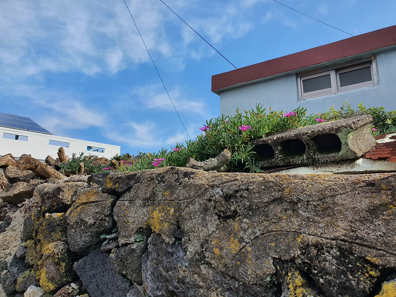 빠르고 더디게 흘러간 제주살이에서 가장 좋았던 건 바다도, 회도, 오름도, 흑돼지도 아니었다. 너무도 당연하지만 때때로 발견이라 부를 수 있는 골목들이었다. "리, 리, 리 자로 끝나는 말은 월정리, 김녕리, 함덕리, 조천리, 신촌, 세화리···". 렌터카 없이 버스로만 정류장을 경유하는 뚜벅이에게 골목은 그 자체로 여행이었다. 담쟁이가 감싸 오른 전봇대와 오래된 나무, 투박하고 정겨운 돌담, 우연히 피어난 들꽃, 소유와 거주의 유혹을 부르는 빈 집터, 그리고 약동하는 이방인의 눈빛에 포착된 생활의 흔적과 빨래 나빌레라······. 파랗고 빨갛고 초록한 정수리(지붕)를 스스럼없이 내어 보이는 덕에 한 뼘 더 자란 기분이었다. 올려야 하고 올려다봐야 할 것투성이인 도시에서는 찾기 힘든 삶의 높이였다.
