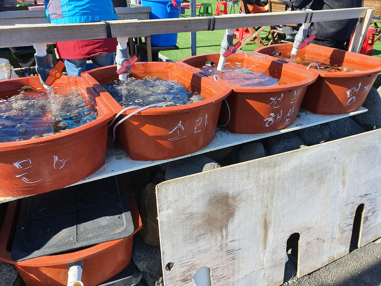 조금 더 가다 보니 뿔소라를 손질하는 아주머니가 보였다. 콸콸콸 물이 쏟아지는 빨간 대야 안에 문어, 소라, 전복, 해삼이 각방을 쓰며 우릴 유혹하고 있었다. 하이라이트는 홀로 뿔소라 한 접시에 호가든을 마시는 아저씨였다. 홈쇼핑이라면 없던 구매욕도 생기게 할 장면이었다. 노상에 실패했던 우리는 아쉬운 대로 이곳에서 뿔소라를 경험하기로 했다.