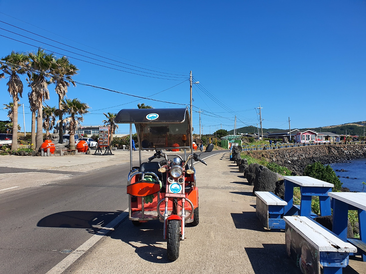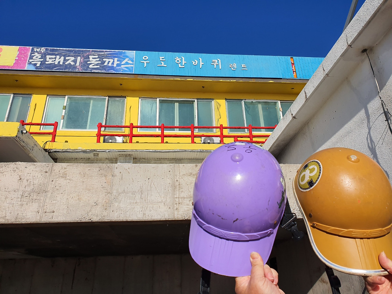 호객행위에 머뭇거리고 싶지 않아 전날 전기차를 미리 예약했더니 업체에서 마중을 나왔다. 우도의 항구는 천진항, 하우목동항 두 곳인데 공사로 인해 천진항이 일시 폐쇄된 상태라고 했다. 하필(?) 천진항 쪽 업체를 예약한 우린 덕분에 봉고차로 우도 골목길 드라이브도 잠시 즐길 수 있었다. 사고가 발생하면 전적으로 내 책임이라는 섬뜩한 각서를 쓰고 헬멧을 골랐다. 감자를 고르듯 이리저리 뒤척이다 보라 하나 노랑 하나를 집어 머리에 이었다. 수년 전 딱 한 번 타본 ATV와 비슷하면서도 전혀 달랐다. 전기차 업체 직원은 운전을 할 수 있으면 쉽게 탈 수 있다고 했지만 그리 간단하지만은 않았다. 가다 멈추다를 반복하며 한동안 헤매고 나니 동네 슈퍼 갈 정도의 실력은 얼추 된 것 같았다. 시리도록 맑은 바다와 마주한 상점들. 우린 그 사이를 스릴 있게 달렸다.