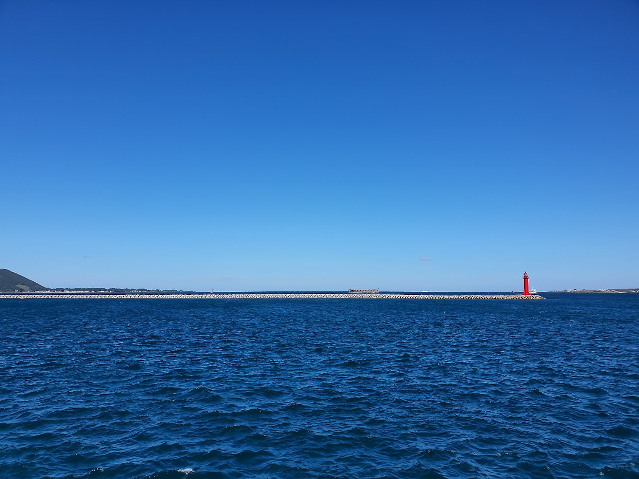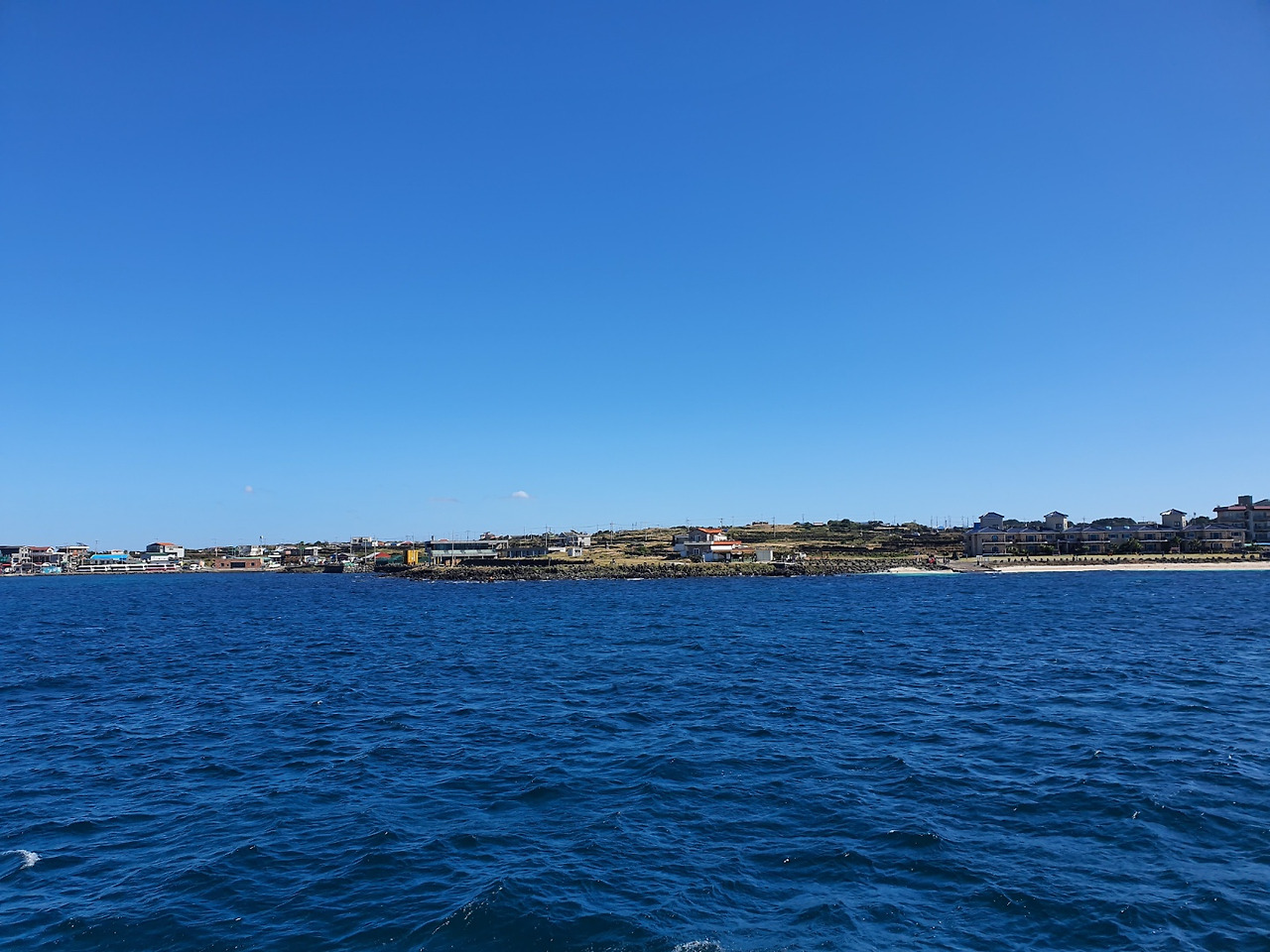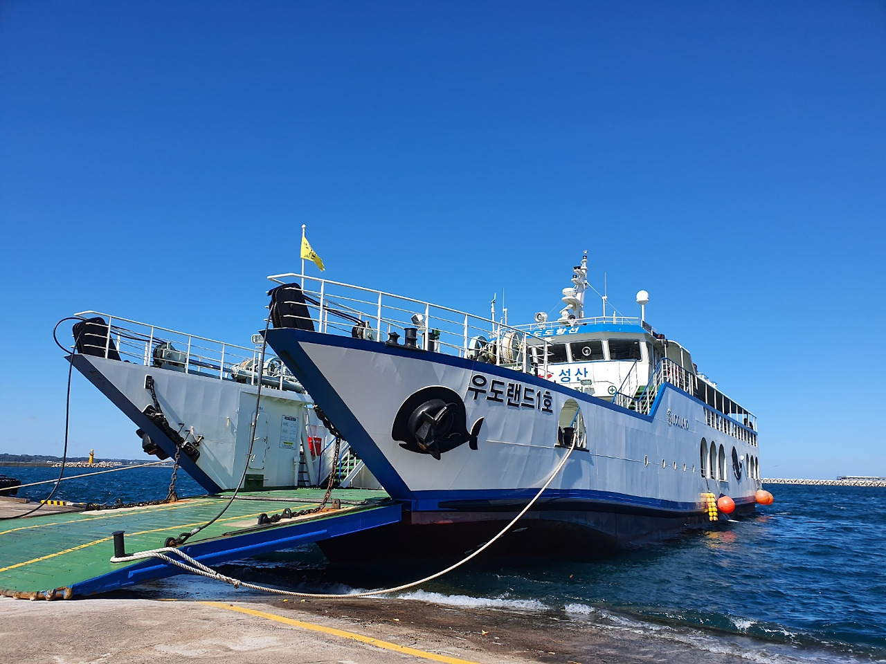 4년 전 한강 크루즈 이후로 처음 타는 배였다. 대기 줄에 합류해 탑승을 기다리는 동안 거대한 여객선 두 척이 바다로 나갔고, 갈매기들은 이 배를 따라갔다가 저 배를 따라오곤 했다. 드디어 우리가 탈 '우도랜드 1호'가 왔다. 소득이 없던 엿장수가 탑승 직전 한 팀에게 엿을 건네고 있었다. 거대한 굉음을 내며 버티고 선 배 위에 올라 우리가 서있던 곳을 바라보았다. 집에서부터 먼 제주로 떠나온 우리 모녀는 우도로 새로운 일탈에 나섰다.