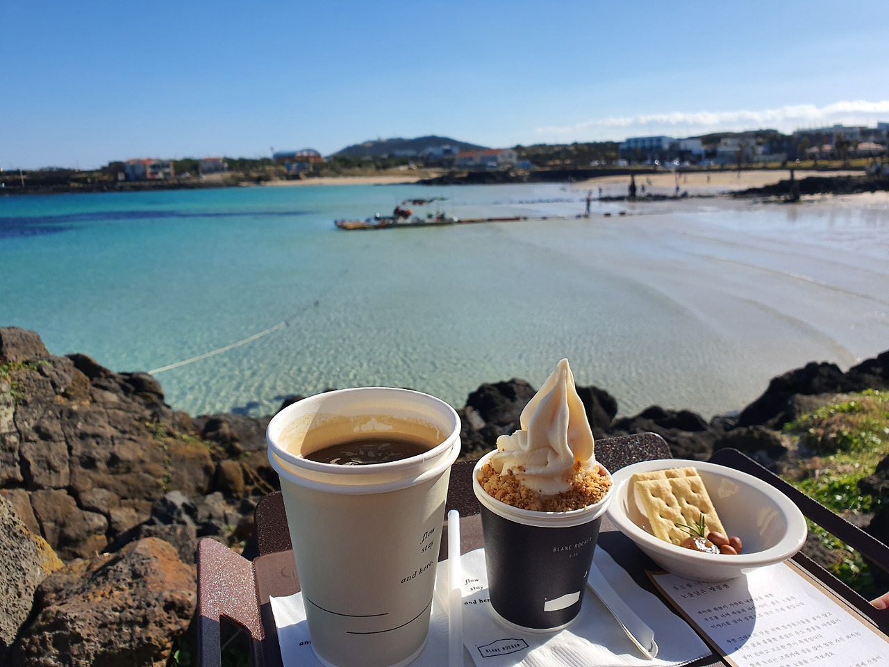 다음 행선지는 바다 바로 앞에 자리한 카페였다. 따뜻한 아메리카노와 (엄마의 제안으로) 땅콩 아이스크림을 주문했다. 부드러운 소프트 아이스크림과 그 위로 뿌려진 고소한 땅콩가루의 궁합은 최고였다. 견과류를 싫어해 '땅콩 아이스크림' 현수막을 본 체 만 체 했던 내가 새로운 반전을 맞는 순간이었다. 시선은 바다를, 손은 바닷바람에 금세 미지근해진 아메리카노를 붙잡고 엄마와 이런저런 이야기를 나눴다. 온 식구가 함께하지 못한 아쉬움, 이전의 여행들, 캠핑 계획, 스카이댄스처럼 나부끼는 나의 진로... 늘 반복되는 일상의 이야기지만 새로운 즐거움을 낳는 엄마와의 대화는 계속해서 흘러가고 흘러오는 바다와 닮아 있다.