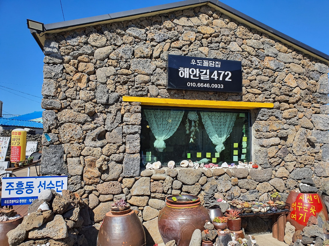 우도에서 먹은 첫 끼니는 생뚱맞게도 김밥과 순두부찌개였다. 전기차 업체에서 준 약도가 보물지도라도 되는 듯 들여다봤지만, 소문이 무성한 수제버거나 짬뽕은 왠지 끌리지 않았다. 마음 가는 대로 향한 곳은 해안길472의 우도돌담집이었다. 모진 바람을 견뎌낸 돌담과 장독대, 들꽃이 참 예쁜 곳이었다. 아기자기한 내부 창가에 나란히 앉은 우리가 유일한 손님이었고, 모녀의 소근소근한 수다와 함께 냄비 부딪히는 소리가 이따금씩 들려왔다.
