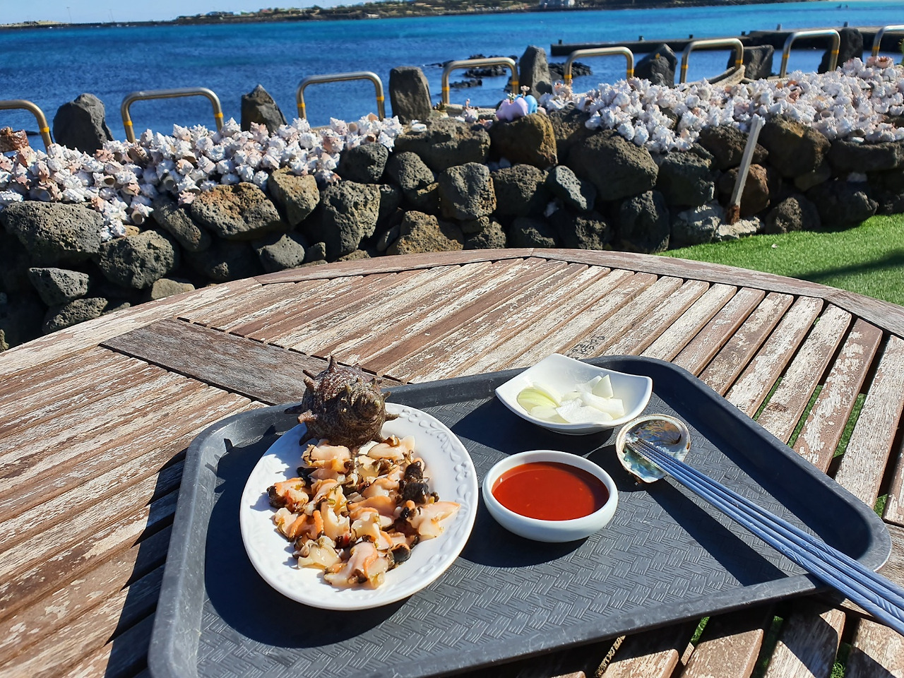 휴게소에서 쉽게 볼 수 있는 검은색 쟁반에 뿔소라 한 접시, 젓가락 두 쌍, 초장이 나왔다. 뿔소라 껍데기 두 조각은 장식이었다. 기름을 바른 듯 윤기가 도는 뿔소라를 씹자 토도독하는 소리가 귓전을 울렸다. 고소하면서도 싱싱한 바다 내음이 입 안으로 딸려 들어왔다. 곧바로 ‘한라산’에 오르고 싶었지만 전기차를 두고 음주는 엄금 사항. 애주가의 미덕을 발휘해 엄마에게만 술을 권했다. 함께하는 자리가 아니면 굳이 마시지 않는 것 또한 애주가의 미덕임을 아는 엄마는 나와의 의리를 지키겠다고 했다. 바람 한 입에 뿔소라 한 점, 뿔소라 한 입에 바다 한 번 바라보며 연신 감탄했다. "제주는 뿔소라네"