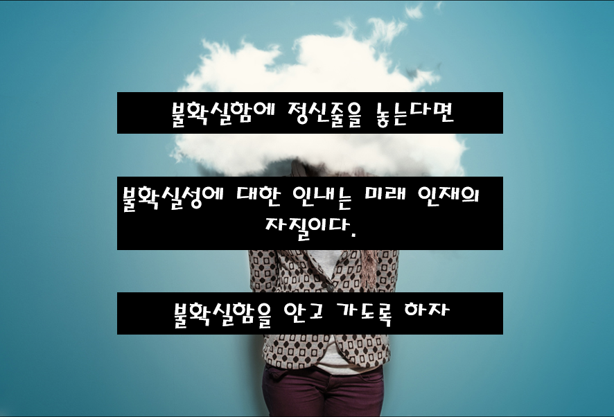 세상은 점점 더 불확실성이 커져간다. 고등학교에서 대학으로, 대학에서 직장으로 옮겨갈 때마다 불확실성은 업그레이드 된다. 불확실성을 없애거나 피해야만 하는 것으로 생각하면, 불확실함을 만났을 때 불안에 빠지게 된다.