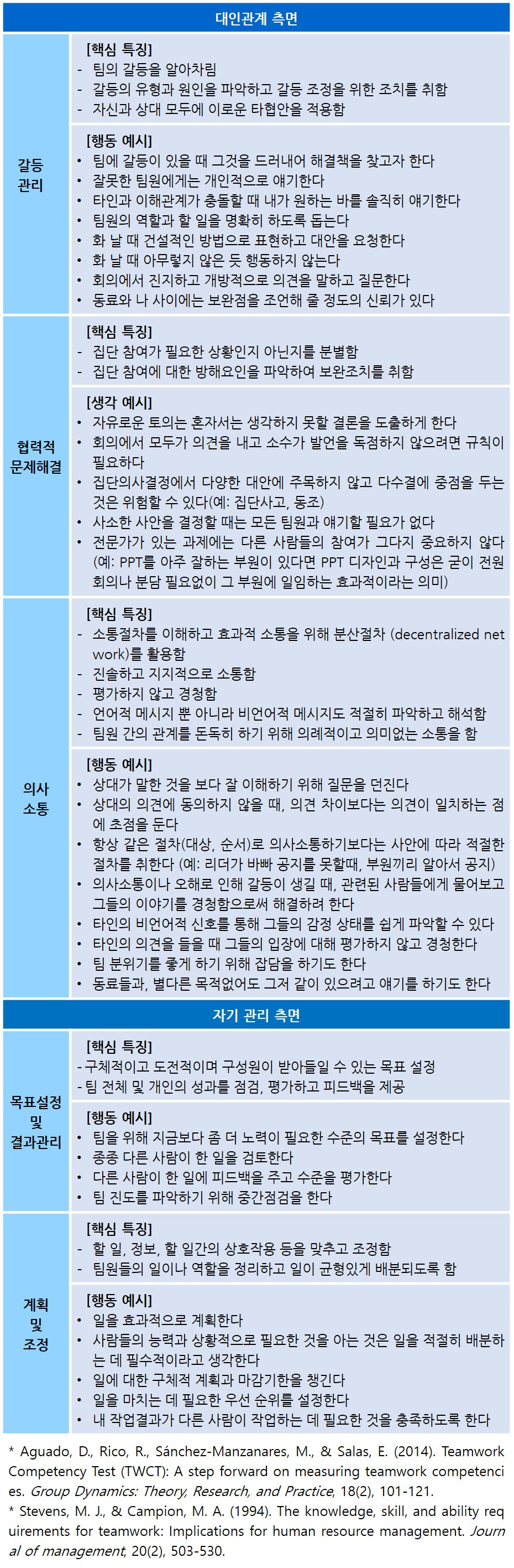 이들이 정리해 놓은 바에 따르면, 팀워크 역량은 크게 대인관계에 대한 것과 자기 관리(일을 완수하는 것과 관련)에 대한 것으로 구분된다. 대인관계는 다른 사람들과 갈등이 생겼을 때 어떻게 대처하는 지, 어떤 상황에서 어떻게 협업하는지, 의사소통은 어떻게 하는지로 나누어지고, 자기관리는 어떤 일을 할 때 결과와 과정을 어떻게 처리하는 지로 구성된다.