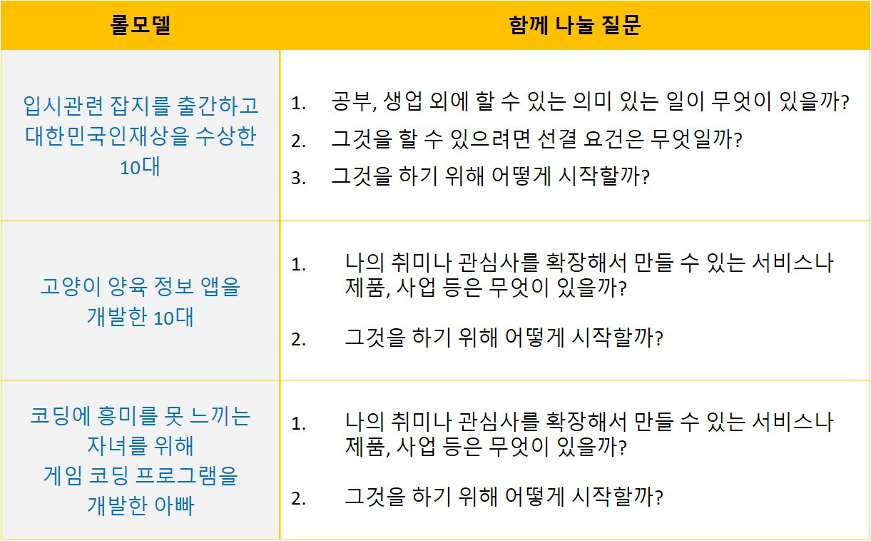 예를 들면 이런 식이었죠. 첫 번째는 아이가 청소년 단체에서 활동을 하고 있었기 때문에, 두 번째는 아이가 고양이를 좋아해서 키우고 있었기 때문에, 세 번째는 아빠가 IT 분야 일을 하고 있기 때문에 생각의 실마리를 줄 수 있을 것으로 기대했습니다.