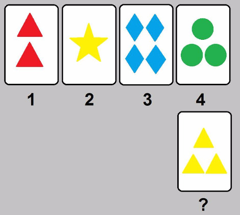 예로 아래 그림을 보자. 물음표 카드를 어떤 문제라고 할 때, 색의 관점에서 보면 2번, 개수의 관점에서 보면 4번, 모양의 관점에서 보면 1번이 같은 유형이 된다.