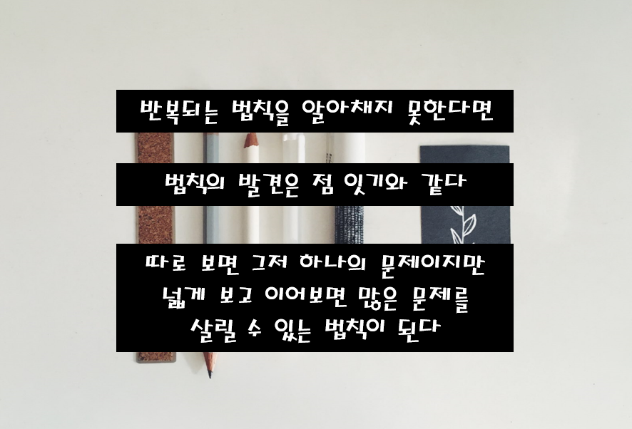 다시 문제로 돌아오면, 문제를 다룰 때는 해당 문제를 개별적으로 볼 것이 아니라 그 문제를 푸는 과정이나 속성이 유사했던 다른 상황들을 떠올려 봄으로써 그 안에서 규칙을 찾아내고자 하는 노력이 필요하다 .