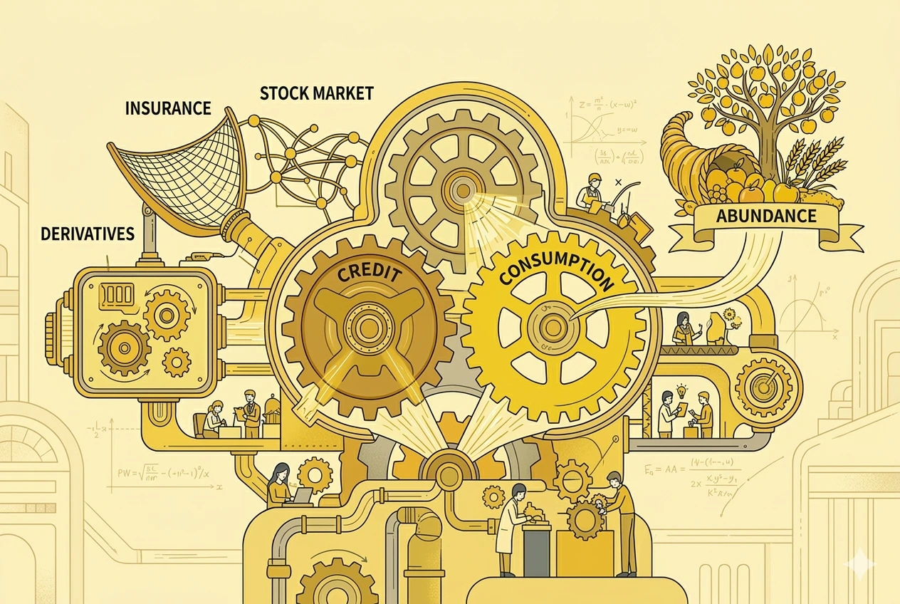 유통시장에서의 주식 거래는 언제든 금융자산을 현금화할 수 있다는 확신을 주며, 발행시장에서의 리스크를 감소시킨다. 은행 예금은 생산활동에 잉여 자금을 융통할 수 있는 매개가 된다. 보험 역시 개인에게 갑자기 닥치면 큰 돈이 들어 위험한 보험사고로부터 가입자를 보호한다. 대수의 법칙에 따라, 보험사는 언제든 보험금을 지급할 여력을 유지하고 있기 때문이다.