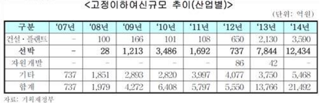 수출입은행(좌), 일반은행(우) '고정 이하 여신비율 변화, 13년 급등하여 14년 최대치를 보인다. (출처: 기획재정부, 예금보험공사)