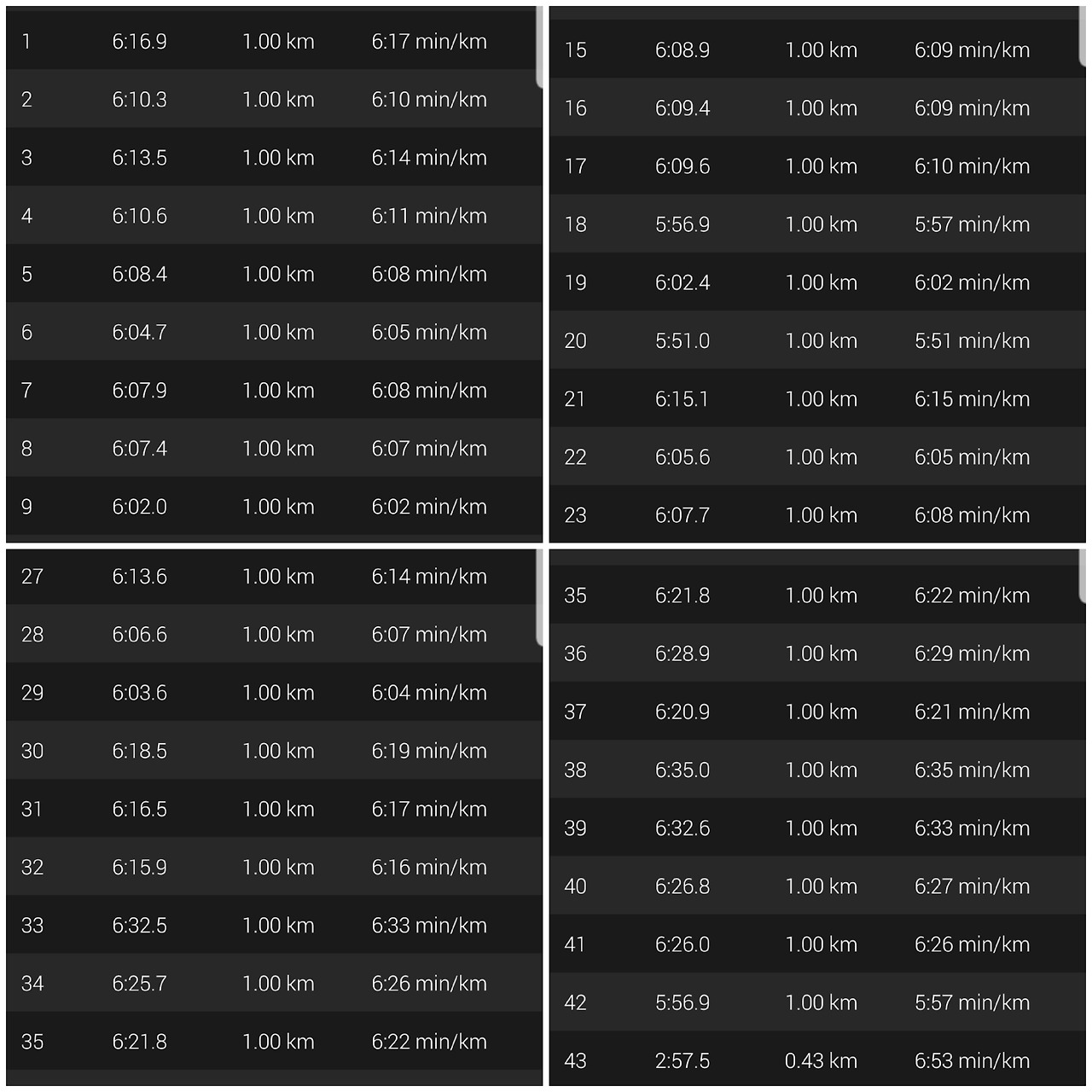 절대 오버페이스 하지 말라는 경험자들의 말을 듣고 6:20 페이스에 맞춰 달리려고 노력했다. 빨라지면 늦추고. 급수대가 나오면 물과 이온음료도 꼭 챙겨 먹고 물 스펀지도 나오면 입술을 적셨다. 9km 지점에서 첫 파워젤을 천천히 먹고 달렸다. 21km 지점에서 하프 주자들이 들어가고 풀 주자들만의 코스로 진입했을 때 그 적막함을 잊을 수 없다. 이제 풀 주자만 남은 것이다. 이제부터 시작이다. 풀코스의 반을 달렸다가 아니라 다시 하프 시작이라는 마음으로 페이스를 늦추지 않고 계속 달렸다.