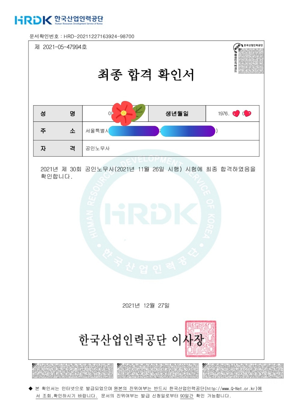 공인노무사 최종합격증서