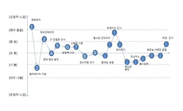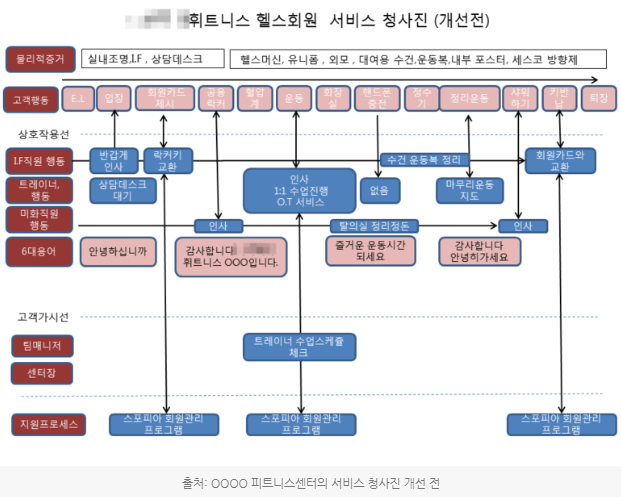 피트니스센터의 서비스 전 과정에 걸쳐 진실의 순간을 도식화하고 고객에게 제공하는 서비스 중에서 고객이 실망을 느끼는 서비스 실패 목록을 만들어 계속해서 개선해 나가야 한다. 실제로 총괄 매니저로 근무하던 시절 서비스 청사진을 그려보며 서비스 프로세스의 문제점을 발견하고 개선했던 사례가 있었다.