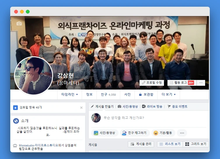 페이스북 개인 프로필 계정을 시작하려면 담벼락이라고 부르는 페이스북 타임라인을 먼저 잘 꾸며놔야 한다. 타임라인이란 나의 이야기를 올리는 곳으로 우선 커버 사진과 프로필사진, 내 소개, 학력, 경력 정보들을 작성 해놔야 한다. 페이스북은 실명기반이기 때문에 이부분을 꾸며 놓는 것이 중요하다.