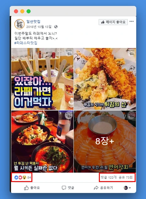 지역마다 페이스북 맛집 페이지가 존재한다. 예를 들어 일산에서 음식점을 운영중이라면 일산맛집, 고양시맛집 등을 검색해보면 활성화 되어 있는 맛집페이지가 나온다 . 그 다음 게시물마다 댓글이나 좋아요를 누르는 페이스 북 유저들을 찾아서 나와 친구를 맺는다. 반응형 페친이 라고도 하며 맛집 먹거리 등에 관심을 보였으므로 우리 매장에도 관심을 보일 확률이 높기 때문이다.