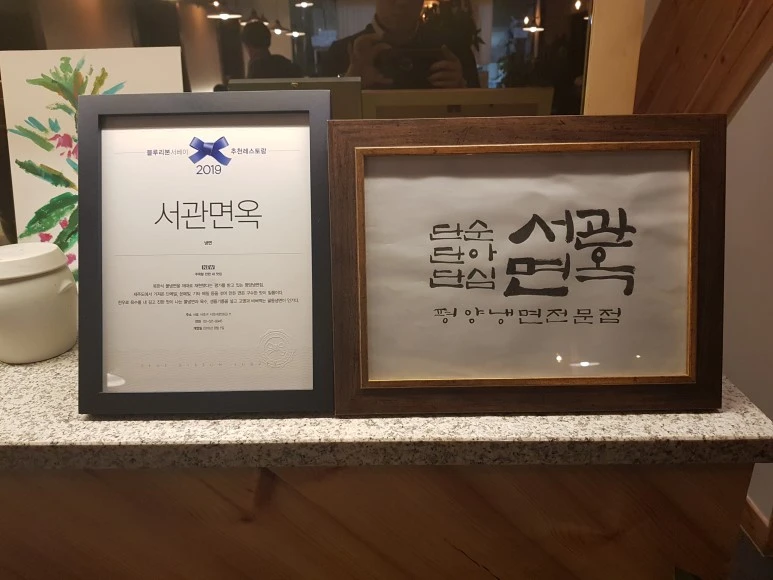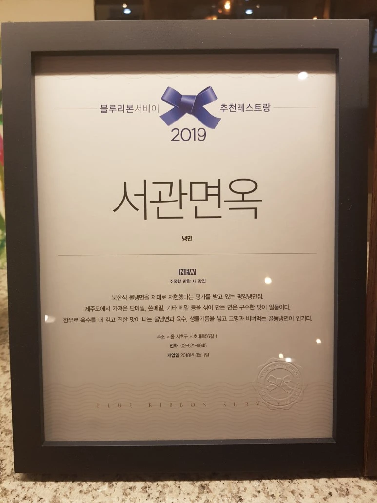 서관면옥은 블루리본서베이에서도 인증된 맛집으로 블루리본 1개는 블루리본 서베이의 회원 및 프리미엄 회원들이 투표한 점수를 합산한 평균 점수의 상위 10~40%의 음식점에게 주어진다. 2개는 평균 점수의 상위 10%의 음식점에게 주어지며, 블루리본 3개는 블루리본 2개를 받은 음식점을 각계각층 연령대별 전문가가 평가하여 결정한다.