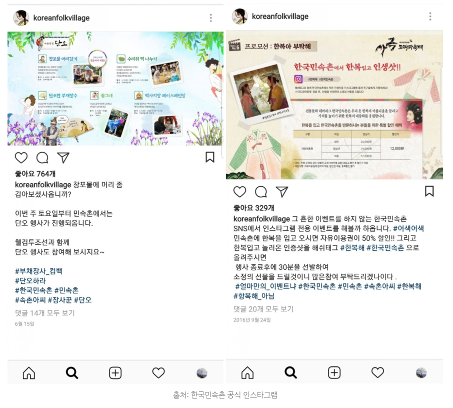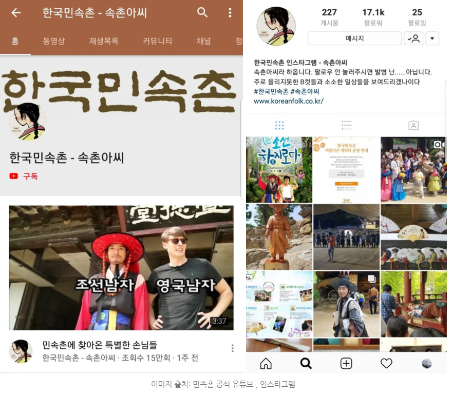 현재 민속촌의 마케팅 채널은 공식 홈페이지를 비롯해 기존 세대들을 위한 블로그, 페이스북, 그리고 젊은층을 겨냥하여 유튜브, 인스타그램을 적극 활용하여 SNS마케팅을 진행하고 있다