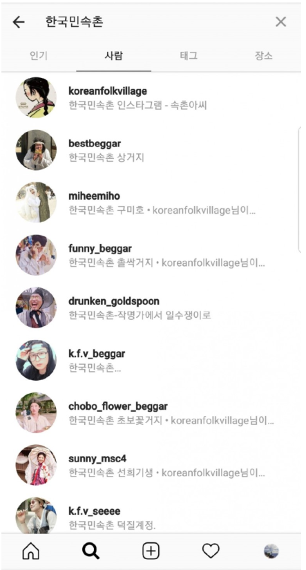 인스타그램에서 [한국민속촌]을 검색해보면 재미있는 별명이 지어진 민속촌 직원들의 개인계정들을 확인할수 있다. 방문한 고객들에게도 흥미를 유발시켜 자발적인 바이럴루프가 생기도록 유도한다. 오랜시간 기억에 남도록 말이다.