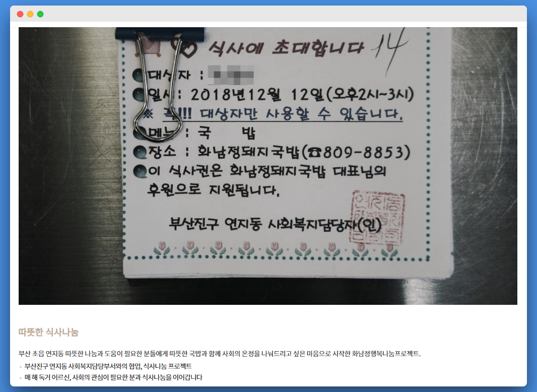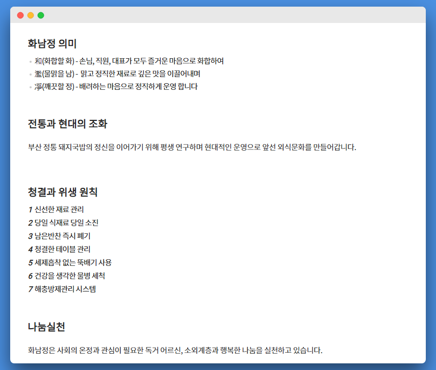 부산 연지동에 위치한 화남정 돼지국밥은 홈페이지와 매장에 신뢰를 줄 수 있는 특별한 요소들이 담겨 있다. 가게의 경영철학과 함께 지역 주민과 불우이웃들에게 나눔 실천을 하며 가게를 운영하고 계신다.