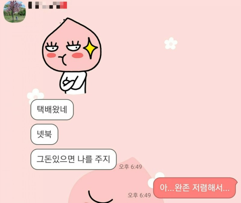 폭풍 검색 끝에 믿을 만한 곳에 마음에 드는 제품을 선택했다. 3개월 AS도 가능했다. 어제 회사에서 저녁 먹는 중에 넷북이 도착했다는 배송 업체 문자가 왔다. 그와 동시에 핸드폰 카톡이 울렸다. 아내였다.