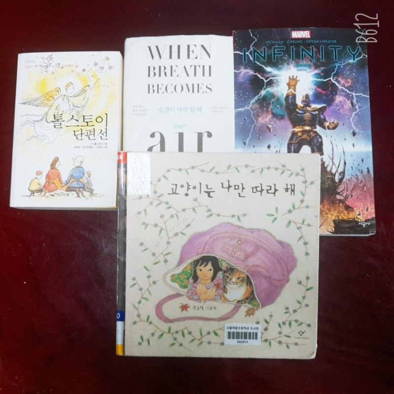 가족 독서 모임 그 다섯 번째 이야기가 시작되었다. 이번에는 자율 도서였다. 오후에 다른 일정이 있어서 집에서 독서 모임을 하였다. 내가 선택한 책은 '숨결이 바람이 될 때'였고 아내는 '톨스토이 단편집', 아들은 마블 코믹스의 '인피티니', 딸은 그림책 '고양이는 나만 따라 해'를 선택했다. 이번에는 딸이 내가 먼저 책을 소개하면 좋겠다는 의견을 내서. 내가 독서 모임 문을 열었다.