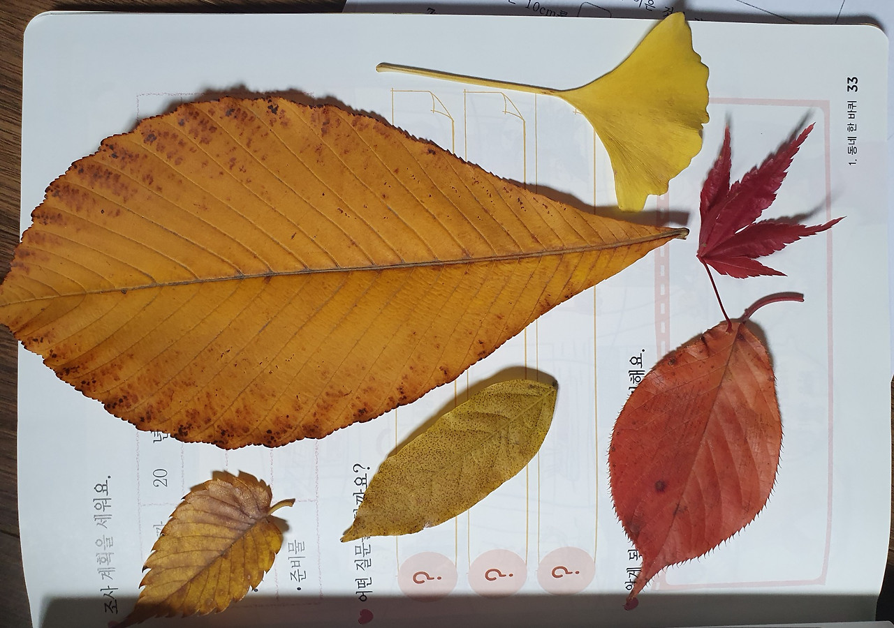 가져온 낙엽을 둘째 교과서 사이에 놓았다. 수요일쯤 되면 잘 마를 것이다.
