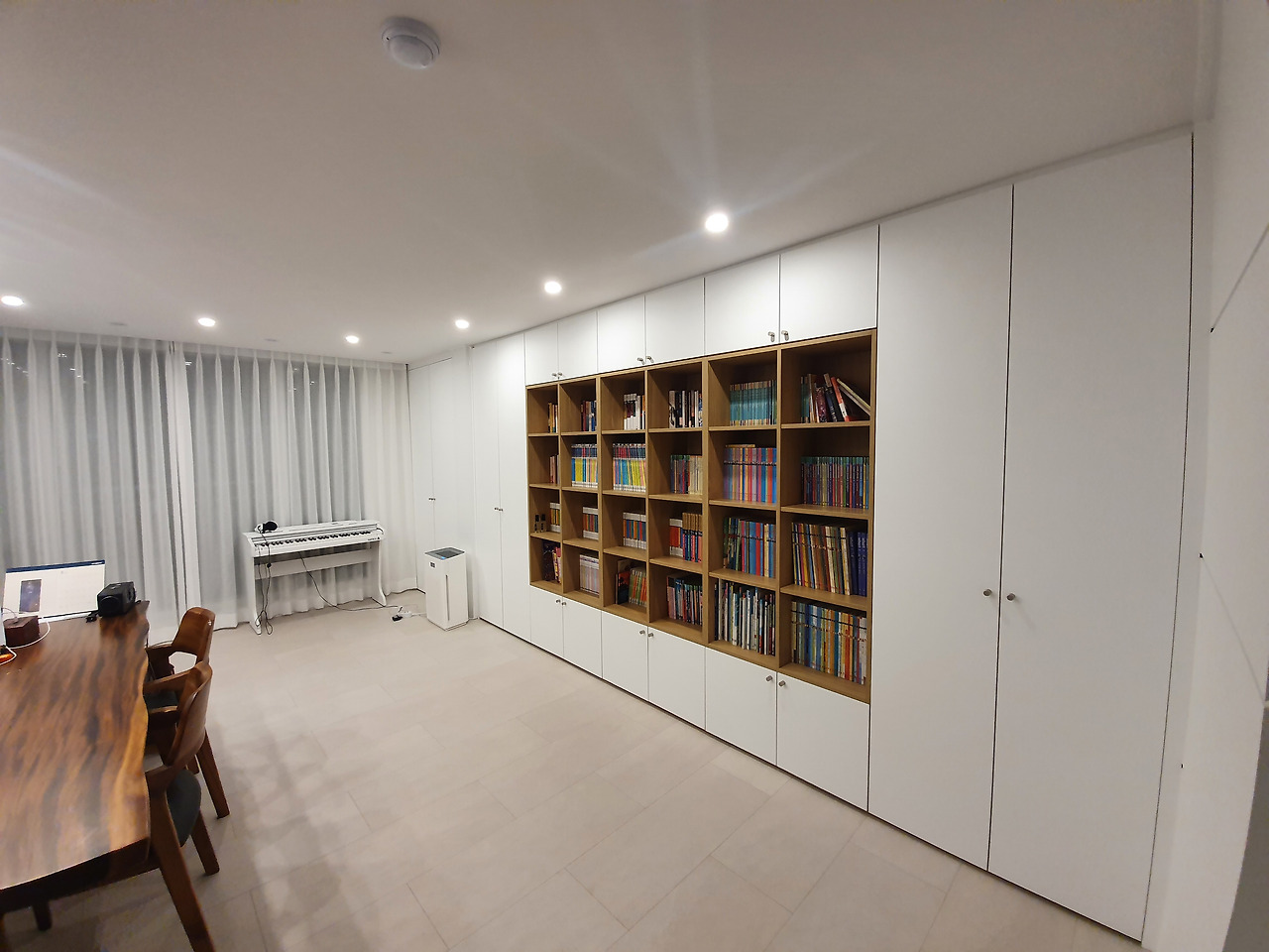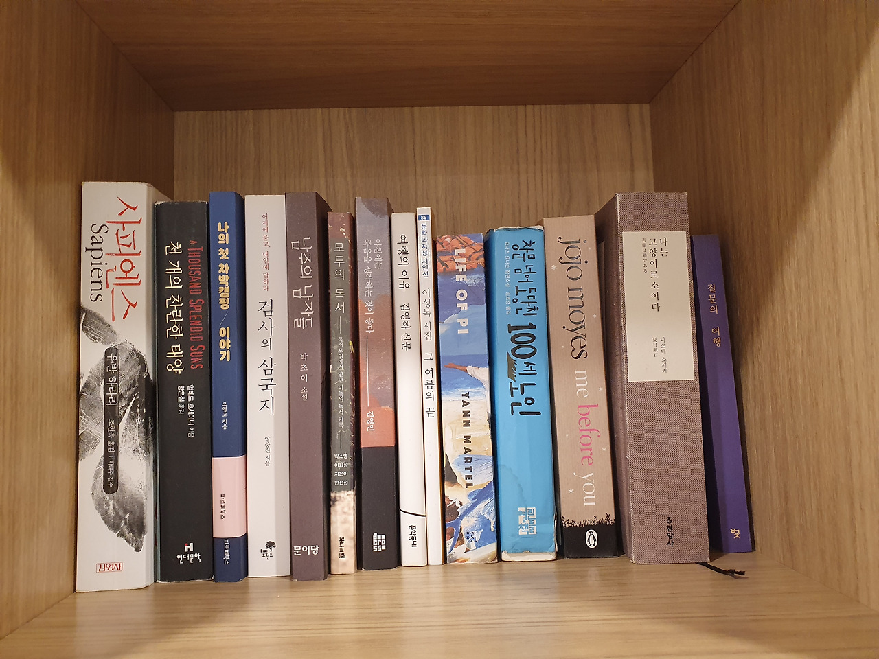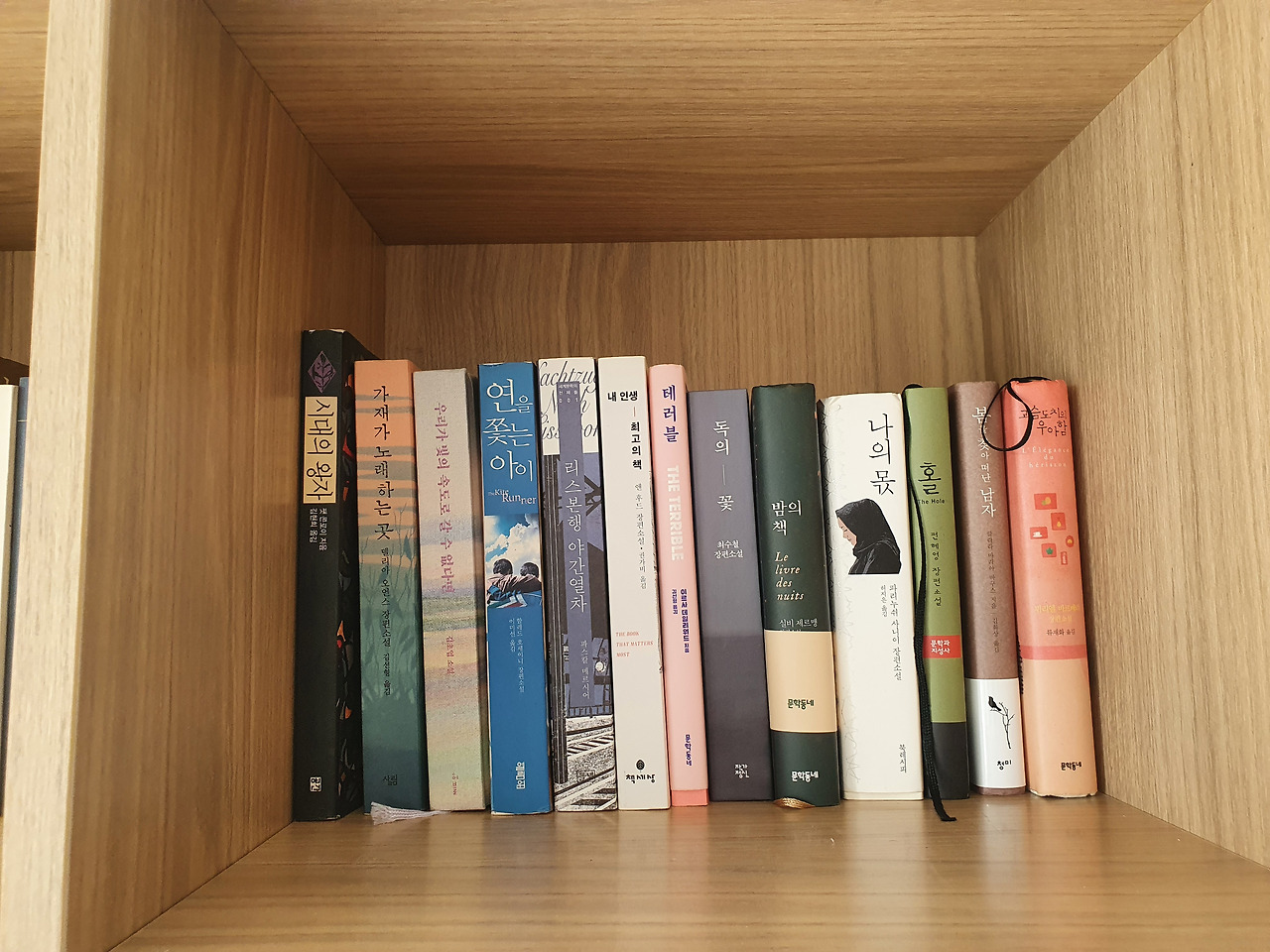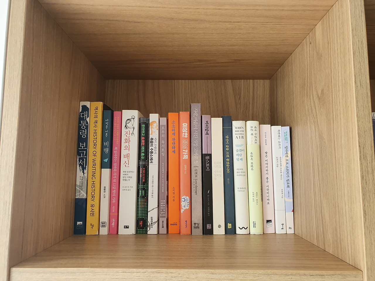늘 나만의 서재를 꿈꿨다. 부족한 책장 때문에 책은 이쪽, 저쪽에 어지럽게 쌓여갔다. 아내와 나는 거실엔 무조건 큰 책장을 만들기로 결심했다. 책장이 들어서고, 아내는 "위에 네 칸은 오빠가 써."라며 통 큰 인심을 보였다. 두 칸, 세 칸도 아니도 무려 네 칸씩이나. 혹여나 마음이 바뀔까 봐 서둘러 책을 꽂았다. 그간 독서 모임에 참여하면서 구입한 책이 한가득 했다. 드디어 책장이 완성되었다. 나름 주제도 있다. 맨 왼칸부터 에세이, 현대소설, 고전소설, 기타 등등이다.