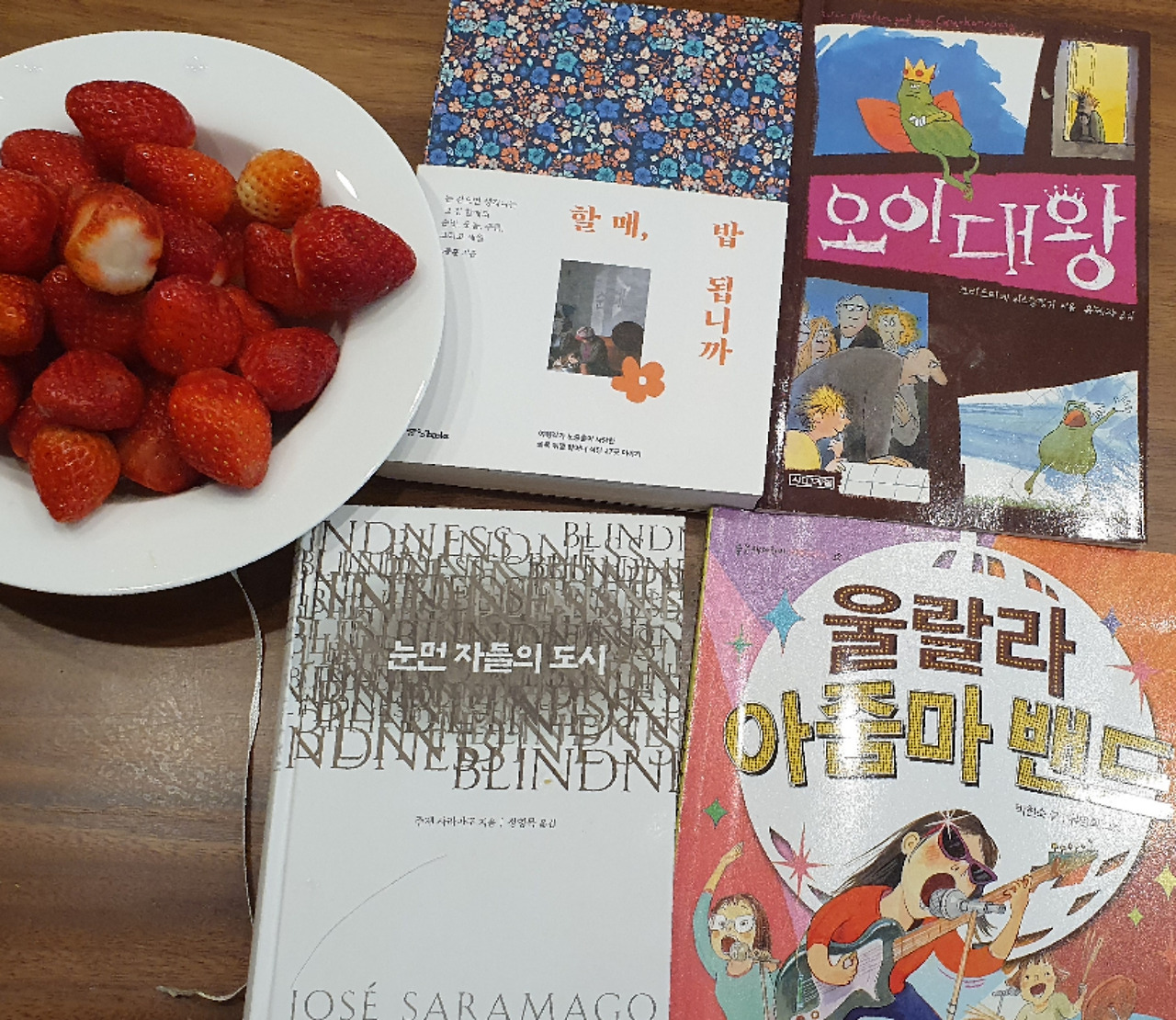 창 밖으로 봄 비가 추적추적 내리는 오후, 우리는 가족 독서 모임을 위해서 모였다. 간식으로 과일을 준비했다. 이번 주는 자율 도서였다.